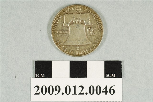 1.本物件是1957年製造之面額半美元之美國錢幣。錢幣材質銀佔90%、銅佔10%。直徑約3.1公分,呈圓形,正、背面幣緣均有凸邊設計,幣邊採齒輪設計。錢幣正面中央鐫美國開國元勳富蘭克林(Benjamin Franklin)面朝左肖像;肖像下方幣緣以逆時針方向鐫「IN GOD WE TRUST」英文,中文意指「我們信仰上帝」;肖像上方自幣緣開始以順時針鐫「LIBERTY」字樣,中文指「自由」之意;肖像右下方鐫「1957」,代表錢幣製造年代。硬幣背面中央鐫自由鐘圖案,圖案左側分別鐫「E ‧」、「 PLURIBUS」、「UNUM」等3排英文,合起來意指「合眾為一」,為美國國徽上的格言;圖案右側鐫美國國鳥展翅圖案;自由鐘圖案正上方鐫有「D」字樣,表示錢幣是由丹佛鑄幣廠製造;錢幣下緣處以逆時針方向鐫「HALF DOLLAR」英文,HALF指的是一半,即指硬幣的面額為半美元;硬幣上緣以順時針方向鐫「UNITED STATES OF AMERICA」英文,以示美國的國號全稱。2.美國在1776年獨立建國,1792年成立美國鑄幣局(United States Mint),負責製造流通貨幣。1794年,美國政府首度發行面額半美元的硬幣。本物件以富蘭克林作為頭像的半美元硬幣始鑄於1948年,主因在於當時的鑄幣局長是富蘭克林的崇拜者,1963年是富蘭克林肖像半美元錢幣鑄造的最後一年,次年硬幣肖像為甫遇刺身亡的美國總統甘迺迪(John Fitzgerald Kennedy)所取代,不過富蘭克林肖像的半美元硬幣,目前在美國仍能有效流通。