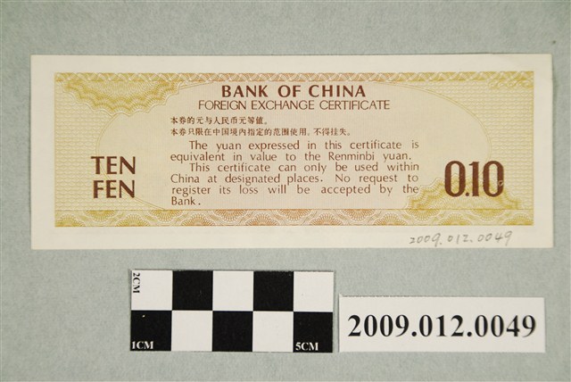 1.本物件為1979年中國銀行發行的面額壹角外匯兌換券。以紅棕色為主墨色,採橫式印製,長約4.8公分、寬約12.8公分。鈔票正面由幾何花紋構成鈔票圖案的方框。方框中央繪製中國貴州黃果樹瀑布圖,圖右下角蓋有篆體之「行長之章」圓形章。上邊框正中央由左而右覆寫「中國銀行」等4字,4字之下方框內由左而右以簡體字書寫「外匯兌換券」等5字。方框內右側繪製菊、綠色構成的幾何底圖,底圖下部由左而右覆寫「壹角」兩字。方框內左側為緊連邊框直立心電圖線條幾何花紋底圖,上底圖書寫「0.10」數字,下底圖由左而右書寫「YW 613705」紅色編號。下邊框中央上緣由左而右書寫「一九七九年」等5字。兌換券背面由紅棕色圍成幾何圖形方框,方框左下處書寫「TEN」、「FEN」兩排英文;右下處書寫「0.10」數字。方框中央共書寫10排由左而右之文字。其中,靠近上邊框處第一排以粗體書寫「BANK OF CHINA」之中國銀行英文;第二排書寫「FOREIGN EXCHANGE CERTIFICATE」之外匯兌換券英文;第三排以簡體字書寫「本券的元与人民币元等值。」;第四排以簡體字書寫「本券只限在中国境内指定的范围使用。不得挂失。」;第五至十排依次書寫「The yuan expressed in this certificate is」、「 equivalent in value to the Renminbi yuan. 」、「This certificate can only be used within」、「 China at designated place. No request to」、「 register its loss will be accepted by the」、「 Bank.」等字樣,為第三、四排簡體字之英文翻譯。