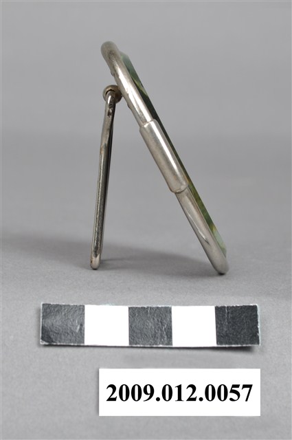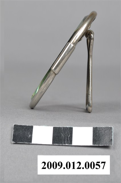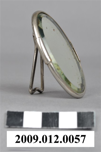 本件金屬框橢圓形桌鏡可分為鏡身與鏡架2部分,呈長6.3公分,寬4.6公分,高0.9公分。鏡面呈橢圓形,鏡身邊緣作向外斜切面,鏡框以亮銀色金屬材質製作,分上下半部包裹鏡框周圍,相接處另以短金屬框疊加相連。桌鏡背面以黑色為底色,上半部邊緣以橢圓形金屬片構件接合鏡架。鏡架以金屬棒製作呈長形ㄩ字形,上端作內束收斂拗折,下端於接近底端之鏡架,左右兩側略為外僘,中間作半圓形略微凸起。使用時將鏡架打開作倒V形,即可放置於桌面,並依照需求調整鏡面角度。該桌鏡主要作梳化鏡使用。