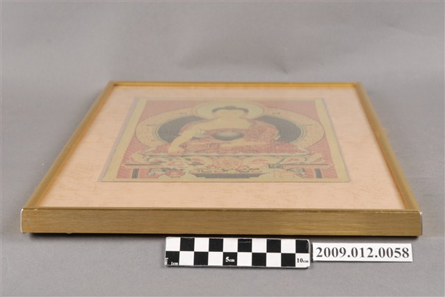 本件為以緙絲織造而成的西藏佛教釋迦牟尼佛畫像,螺髮披法衣袒胸。手勢為觸地印,左手置於膝上捧缽,右手下垂,掌心向內伸五指。雙腿結跏趺坐(雙盤)。畫像裱框。佛教起源於印度,創始人釋迦牟尼。依文化和所使用的經典而言,佛教可以分為三種傳統:印度佛教、中國佛教和西藏佛教。西藏佛教以藏文《大藏經》為聖典的地方,涵蓋範圍有西藏、蒙古和不丹等地。