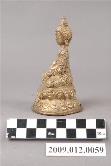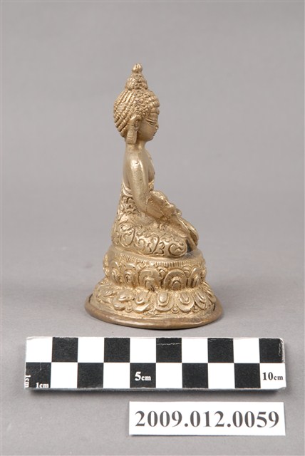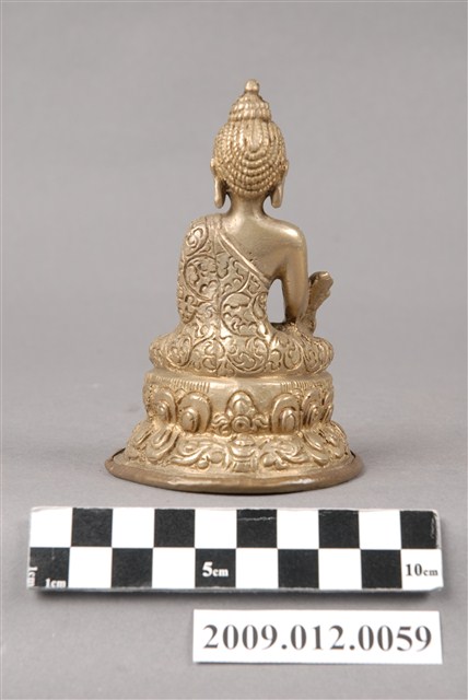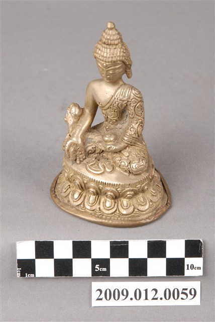 本件為金屬製藥師佛神像,銅合金。螺髮雙目微垂,身穿袒右肩法衣,左手置於膝上捧一物(可能為藥缽),右手下垂,掌心向外伸五指。雙腿跏趺坐於蓮花座上。藥師佛為佛教東方淨琉璃世界之教主,此佛誓願不可思議,若有人身患重病,眷屬盡心供養藥師佛,讀誦《藥師如來本願功德經》、燃燈等功德使其人得以續命,此之信仰自古即盛行。