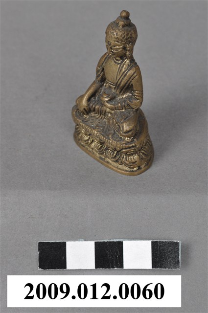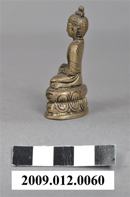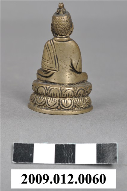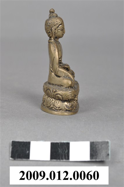 本件為金屬製釋迦牟尼佛神像,銅合金。螺髮身穿袒右肩法衣。手勢為觸地印,左手置於膝上捧一物,右手下垂,掌心向內伸五指。雙腿半跏趺坐(單盤)。釋迦牟尼佛坐於蓮花座上。釋迦牟尼佛為佛教創教者,誕生於公元前500年左右,印度迦毗羅衛國淨飯王之子,名喬達摩.悉達多。