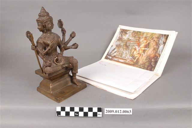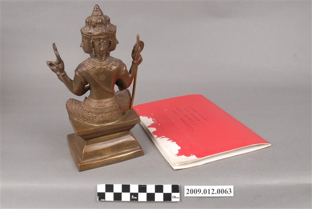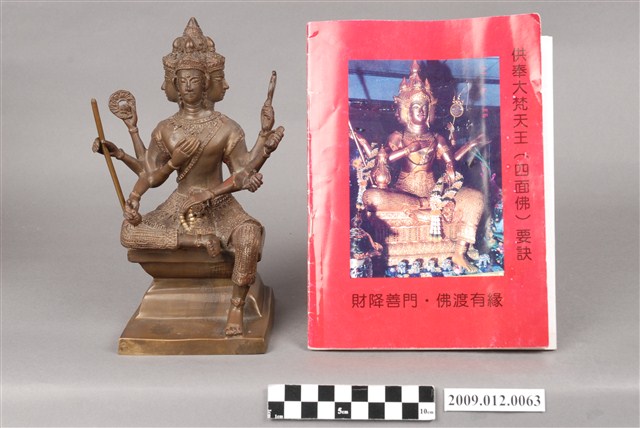 本件為金屬製四面佛神像與《供奉大梵天王(四面佛)要訣》。四面佛,人身四顆頭臉八隻手,手各執念珠、權杖、水壺、法輪等等。坐姿採舒坐,左腳自然下垂、右腳盤起。神像旁有一本《供奉大梵天王(四面佛)要訣》之書本,紅色書皮,封面為一尊四面佛神像,左側直書「供奉大梵天王(四面佛)要訣」,下方橫書「財降善門‧佛渡有緣」,書籍內容為四面佛之簡介。四面佛即為梵天,在印度教中,被尊為「造物主」、「創造之神」,與毗濕奴、濕婆並列為三大主神。在東南亞的泰國、柬埔寨、臺灣等地可見到供奉四面佛,此四面代表能賜福功名、感情、財富、健康等好運。