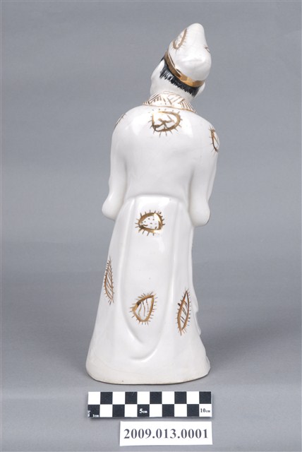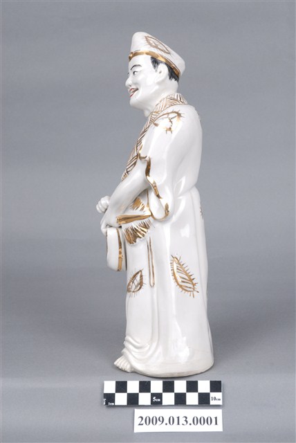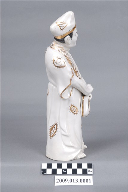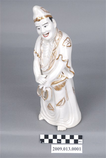 1. 本件為描金彩繪濟公神像瓷偶,為陶瓷材質,瓷偶以注漿模製而成,在保存狀況上,瓷偶頸部有一道幾近斷裂的裂痕。通器施釉,以白瓷為基底,上以金彩描出紋樣點綴裝飾,頭部以黑釉繪頭髮與眉毛及眼珠、以紅釉繪嘴唇,以突顯神像的面容神情。瓷偶造型為濟公模樣,腳踏三七步,頭戴船形帽,赤腳,以左手提著鞋;著寬鬆大袍,衣襟未束緊而露出胸膛,袍上正背面都有以描金彩繪的三角形網格狀補丁,整體表現出濟公自成一格的顛僧形象。2. 瓷偶一類作為擺飾用途的陶瓷產品,原來風行於歐美與日本地區,造型多見精緻的娃娃與動物、卡通人物等等,又被稱作「西洋玩偶」或「西洋藝術陶瓷」。早期臺灣以苗栗地區生產裝飾陶瓷最為盛行,在1980年代達到鼎盛時期,在公館鄉有多達400家的陶瓷工廠。裝飾陶瓷工廠起初主要是做替國外陶瓷廠代工的生意,後來也自行開發商品,因此如本件作品般的中國傳統題材也頗為常見。