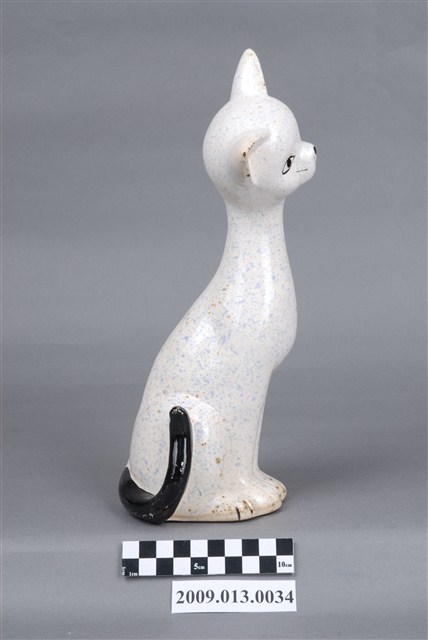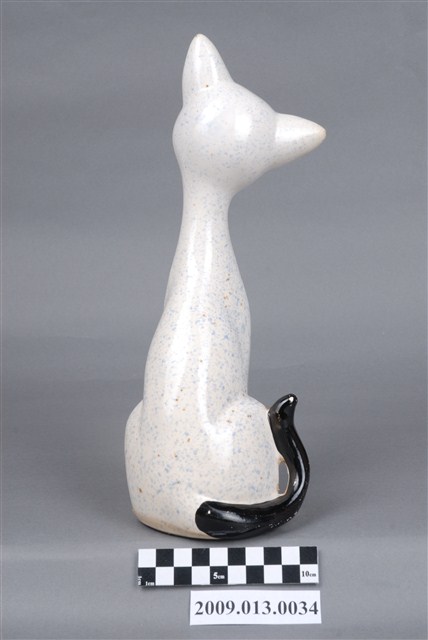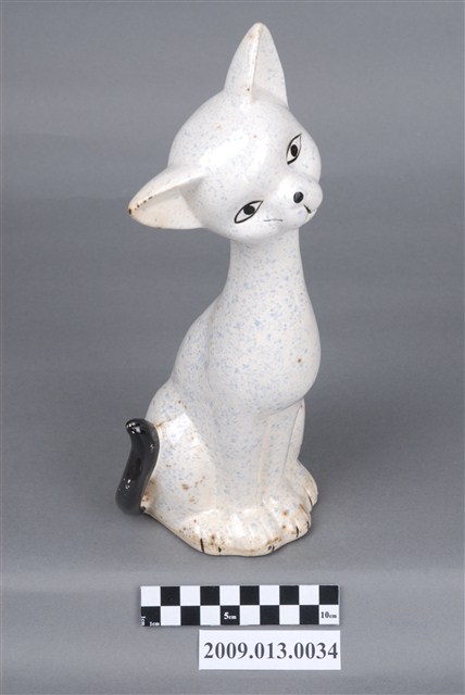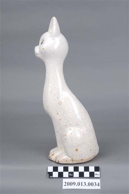 1.本件為苗栗地區產製之彩釉貓咪造型瓷飾,貓咪立坐,斜歪頭,伸長脖子作好奇的樣子。除了五官及尾巴繪黑彩之外,貓身施乳白色釉,其上噴飾淡藍釉彩,豐富顏色裝飾。2.裝飾陶瓷又稱為西洋玩偶,這類玩偶產品以外銷歐美為導向,在臺灣以苗栗公館為生產重鎮。玩偶的繪彩方式不只有使用毛筆上彩一種,有時需要呈現色彩暈染或漸層效果,亦需用噴槍的方式繪彩。此外,使用噴槍繪彩也較快速,有利於大量生產,因此廣用於動物造型的裝飾陶瓷。