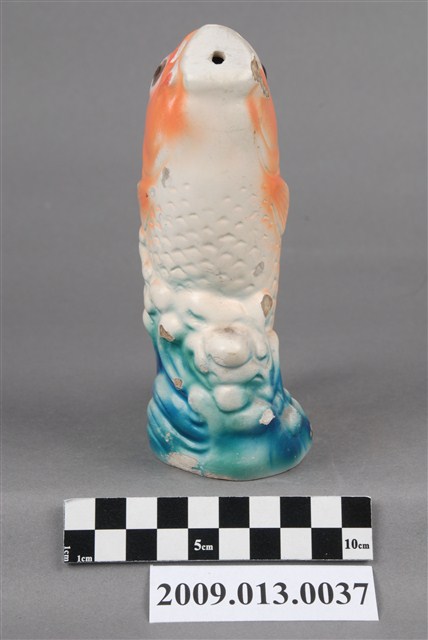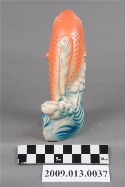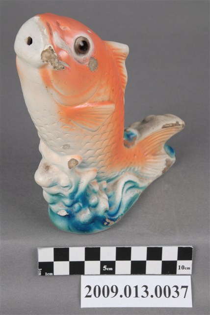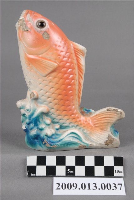 1.本件臺灣鶯歌窯鯉魚裝飾陶瓷主要作觀賞擺飾用途,通身以瓷土製作,採石膏模注漿灌模塑形,於表面以白色釉料為底,另用紅、藍等各色釉料以空氣噴槍將釉料噴塗至器表,形成帶有濃淡色澤的產品。本件裝飾陶瓷外型作魚頭朝上的立型紅色鯉魚造型,魚尾底部以波浪水紋作裝飾。整體呈現鯉魚躍水姿態。其鯉魚嘴部帶有圓孔,魚身右側嘴部與眼部及底部水波紋皆有磕碰痕跡,露出胎體。2.裝飾陶瓷泛指不具實用功能、僅作擺飾之用的瓷器,又稱作「西洋藝術陶瓷」或「西洋玩偶」。裝飾陶瓷著重寫實細膩的手繪技巧、色彩鮮艷、精巧細緻供人賞玩收藏,產品造