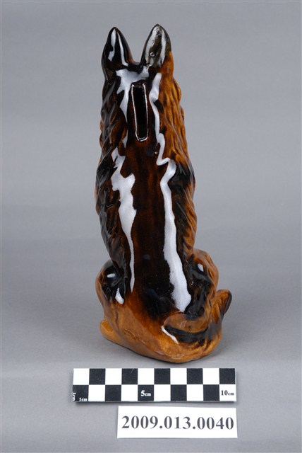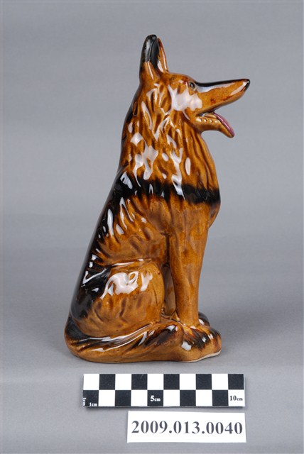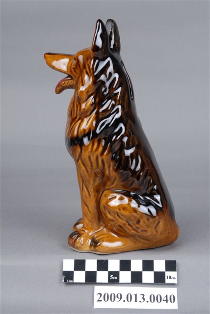 1.本件臺灣鶯歌窯褐釉德國狼犬造型存錢筒主要作觀賞擺飾與儲蓄用途,通身以瓷土製作,採石膏模注漿灌模塑形,於表面施以淺褐色釉料,其耳朵至背部以空氣噴槍噴塗黑色釉料裝飾。本件裝飾陶瓷外型以德國狼犬為造型,其姿態以後肢坐地,前肢站立狀,嘴部開口露出紫紅色舌頭。另外頭部後腦處,開有直式細長的長方形孔,作錢幣投入孔。2.裝飾陶瓷泛指不具實用功能、僅作擺飾之用的瓷器,又稱作「西洋藝術陶瓷」或「西洋玩偶」。裝飾陶瓷著重寫實細膩的手繪技巧、色彩鮮艷、精巧細緻供人賞玩收藏,產品造形種類包括小玩偶、動物、卡通塑像、花卉、瓶