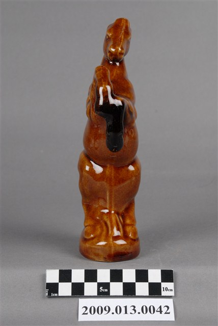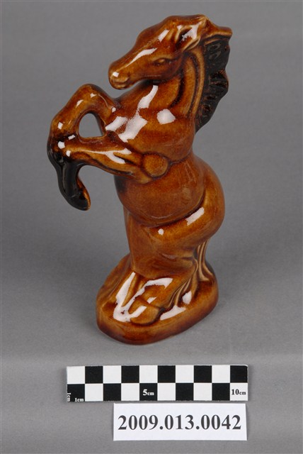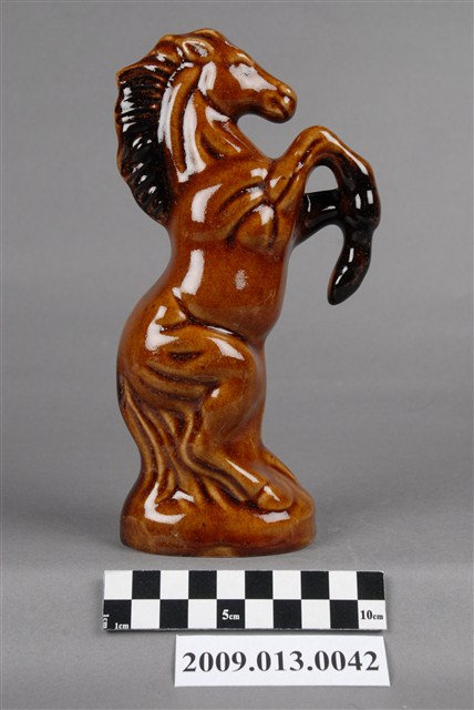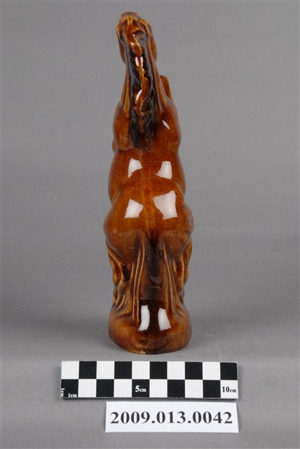 1.本件臺灣鶯歌窯褐釉躍馬裝飾陶瓷主要作觀賞擺飾用途,通身以瓷土製作,採石膏模注漿灌模塑形,於器身留有分模線痕跡。其表面施以淺褐色釉料,其前肢與頸後鬃毛以較深褐色裝飾。本件裝飾陶瓷外型作馬匹造型,其姿態呈站立準備躍起狀,後肢雙腿微彎,尾部連接底座,與後肢同時發揮支撐作用,前肢作縮起彎曲狀。2.裝飾陶瓷泛指不具實用功能、僅作擺飾之用的瓷器,又稱作「西洋藝術陶瓷」或「西洋玩偶」。裝飾陶瓷著重寫實細膩的手繪技巧、色彩鮮艷、精巧細緻供人賞玩收藏,產品造形種類包括小玩偶、動物、卡通塑像、花卉、瓶飾等,以歐、美、日