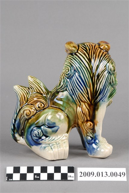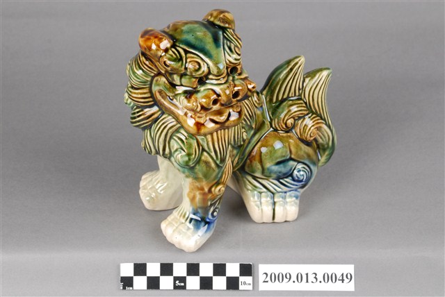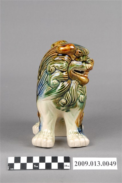 1.本件臺灣鶯歌窯三彩獅型擺飾主要作觀賞擺飾用途,通身以白色瓷土製作,採石膏模注漿灌模塑形。其表面施以透明釉料,並於全身點綴褐色、綠色與藍色釉料燒製而成。本件擺飾外型作獅子造型,後肢呈蹲坐狀,前肢站立,身軀挺立,尾部向上捲起成雙尾分岔狀,頭部偏往左方,面部呈開口露齒吐舌貌,其眼部與鼻部作圓形透孔。2.鶯歌窯業肇始年代明確可考為 1804 年福建泉州磁灶人吳鞍渡海來臺,於鶯歌築窯製陶,為鶯歌陶瓷之始。最早燒製磚瓦開始,逐漸發展傳統的日用粗陶器,包括陶缽、陶甕、茶壺、龍罐、香爐、金斗甕、狗母鍋、醬菜甕等器物