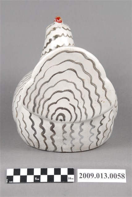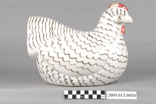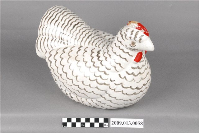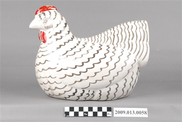 1.本件臺灣鶯歌窯白釉黑繪母雞裝飾陶瓷主要作觀賞擺飾用途,通身以偏灰瓷土製作,採石膏模注漿灌模塑形。其表面施以白色釉料,再以手繪方式於身軀表面描繪黑色羽毛線條後燒製完成。擺飾以母雞為造型,姿態為雙腳收起,坐於地面呈孵蛋狀。頭頂頭冠與喉冠直接於表面彩繪紅色,漆料略帶有剝落痕跡。2.鶯歌窯業肇始年代明確可考為 1804 年福建泉州磁灶人吳鞍渡海來臺,於鶯歌築窯製陶,為鶯歌陶瓷之始。最早燒製磚瓦開始,逐漸發展傳統的日用粗陶器,包括陶缽、陶甕、茶壺、龍罐、香爐、金斗甕、狗母鍋、醬菜甕等器物。1960年代開始發展