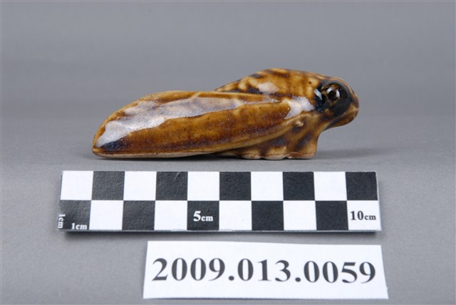 1.本件臺灣鶯歌窯褐釉蟬造型裝飾陶瓷主要作觀賞擺飾用途,通身以偏灰瓷土製作,採石膏模注漿灌模塑形。其表面施以淺褐色釉料,眼部裝飾深褐釉料,擺飾底緣與底面呈胎體原色。本件裝飾陶瓷外型以蟬為造型。2.裝飾陶瓷泛指不具實用功能、僅作擺飾之用的瓷器,又稱作「西洋藝術陶瓷」或「西洋玩偶」。裝飾陶瓷著重寫實細膩的手繪技巧、色彩鮮艷、精巧細緻供人賞玩收藏,產品造形種類包括小玩偶、動物、卡通塑像、花卉、瓶飾等,以歐、美、日風格的瓷偶居多。由於裝飾陶瓷的產品精緻美麗,深受外國人士的喜愛,製品全以外銷歐美市場為主,為197