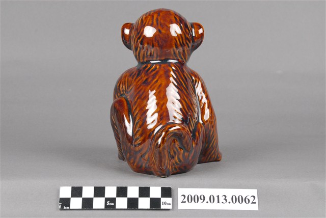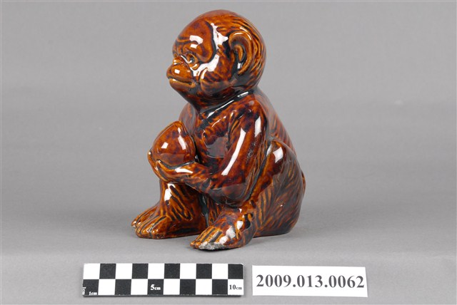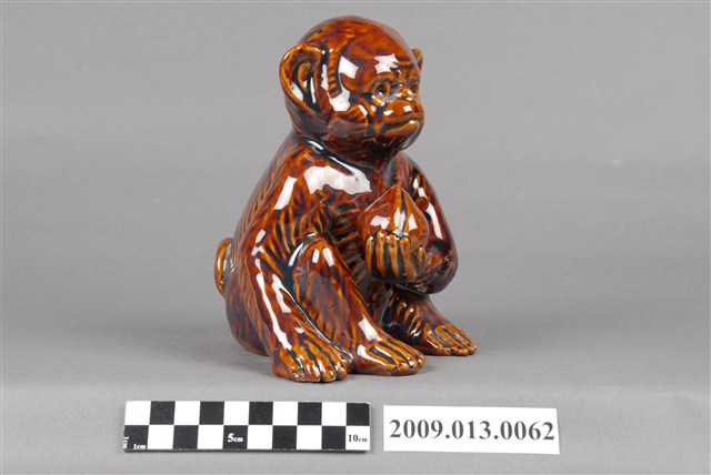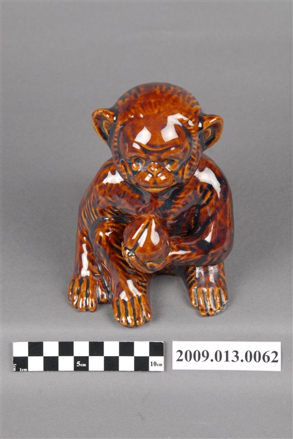 1.本件臺灣鶯歌窯褐持桃猴子造型裝飾陶瓷主要作觀賞擺飾用途,通身以瓷土製作,採石膏模注漿灌模塑形,於表面施以深褐色釉料。本件裝飾陶瓷外型作擬人化猴子造型,姿態作席地蹲踞狀,右手扶地,左手持有桃子於胸前,頭部與眼睛直視前方。2.裝飾陶瓷泛指不具實用功能、僅作擺飾之用的瓷器,又稱作「西洋藝術陶瓷」或「西洋玩偶」。裝飾陶瓷著重寫實細膩的手繪技巧、色彩鮮艷、精巧細緻供人賞玩收藏,產品造形種類包括小玩偶、動物、卡通塑像、花卉、瓶飾等,以歐、美、日風格的瓷偶居多。由於裝飾陶瓷的產品精緻美麗,深受外國人士的喜愛,製品