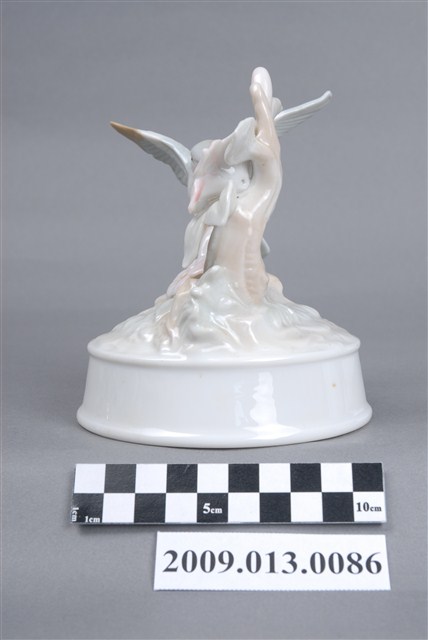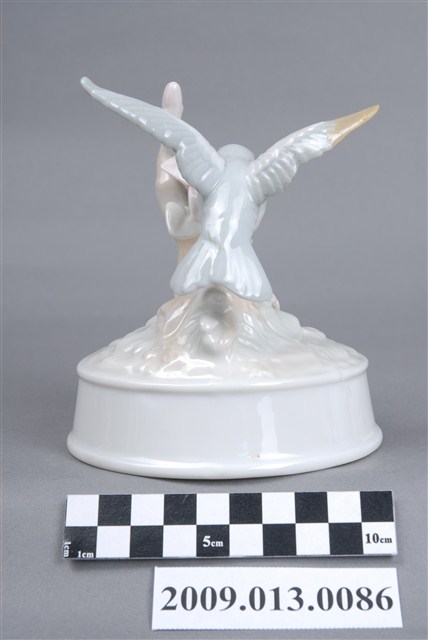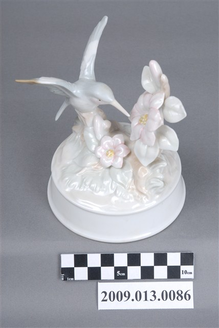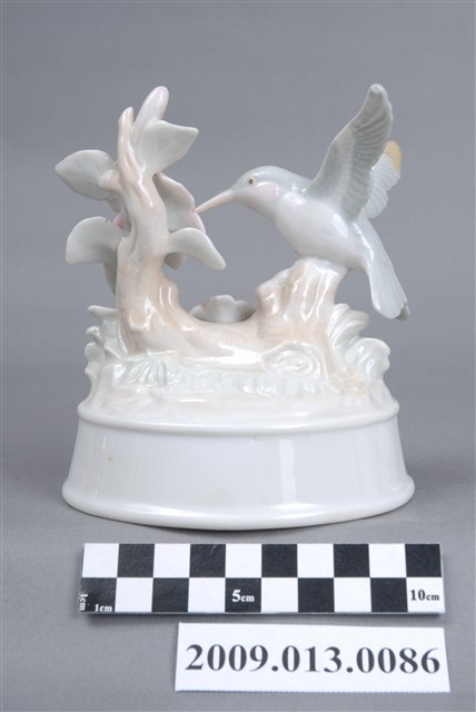 1.本件為彩繪蜂鳥花卉音樂鈴,音樂鈴基座上飾花草,枝上棲息一展翅蜂鳥。全器施釉下彩,釉面平滑且富有光澤,釉色以淡粉藍、淡粉紅為主要色調。整體造型與釉彩裝飾都顯得優雅精緻。2.「軒宇陶瓷公司」及「元好陶瓷公司」是以生產釉下彩繪裝飾陶瓷而知名的工廠。釉下彩以高溫燒製,釉面平滑有光澤,釉色較淡雅。其中「軒宇陶瓷公司」於1970年代後期至1980年代曾產製與本件作品相似造型的音樂鈴,推測本件音樂鈴亦產於此處。