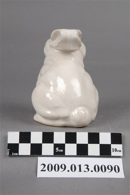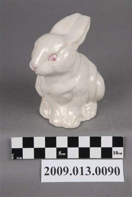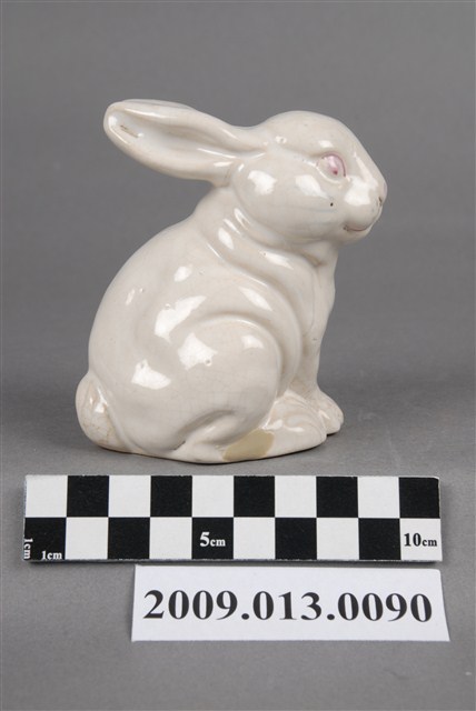 1.本件臺灣鶯歌窯白釉兔子造型裝飾陶瓷主要作觀賞擺飾用途,通身以瓷土製作,採石膏模注漿灌模塑形,於表面施以白色厚釉,另於眼部與嘴部以紅色與藍色淡釉裝飾眼睛與鬍鬚。擺飾表面帶有燒製時遺留的氣泡孔,以及因為釉料收縮冷卻形成的開片痕跡。本件裝飾陶瓷外型作兔子造型,姿態作席地蹲踞狀,後肢蹲坐於地面,前肢直立撐起,雙耳併攏,頭部作抬望狀。另於右後腳觸帶有偏灰塑鋼土填補痕跡。2.裝飾陶瓷泛指不具實用功能、僅作擺飾之用的瓷器,又稱作「西洋藝術陶瓷」或「西洋玩偶」。裝飾陶瓷著重寫實細膩的手繪技巧、色彩鮮艷、精巧細緻供人