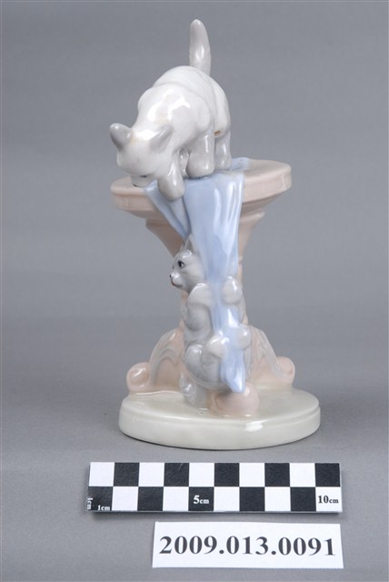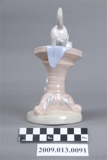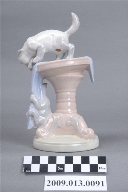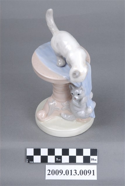 1.本件為苗栗地區生產之彩繪雙貓遊戲造型擺飾,灰白貓立在桌上踩著桌巾,低頭拉著抱著桌巾的灰貓,而灰貓則四肢緊抓著桌布,生怕跌落桌下,兩貓的重量則使桌面側傾,顯得岌岌可危,整體互動的場景相當活潑生動,富有趣味。全器施釉,釉面平整光滑。以釉下彩賦彩,以粉紅色、粉藍色及淺灰色為主色調。2.苗栗裝飾陶瓷生產的產品類型以動物、節慶飾品、及西洋人偶為主。為追求動物類產品能夠製作地更加寫實逼真以增加產品競爭力,苗栗公館地區最大的陶瓷工廠「精華藝術陶瓷公司」甚至在廠內設立動物園,並建立動物圖片與書籍的資料庫,以便於設計師尋找靈感和揣摩。