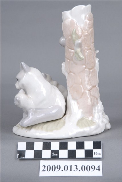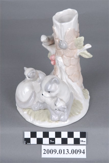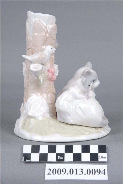 1.本件臺灣苗栗產親子貓咪造型檯燈座兼具實用與觀賞用途,通身以瓷土製作,採灌模塑形,於表面白色為底,另用各色釉料裝飾後燒製完成。燈座造型呈圓形底座,底座前端以臥躺貓咪,懷中與背上各有一隻幼貓為主要造型。底座後立有樹幹造形圓柱,表面裝飾樹皮細節,枝幹上站立小鳥。樹幹頂端帶有圓形開口,內部呈中空狀,可固定電燈座,電線由內部穿出。2.裝飾陶瓷泛指不具實用功能、僅作擺飾之用的瓷器,又稱作「西洋藝術陶瓷」或「西洋玩偶」。裝飾陶瓷著重寫實細膩的手繪技巧、色彩鮮艷、精巧細緻供人賞玩收藏,產品造形種類包括小玩偶、動物、卡通塑像、花卉、瓶飾等,以歐、美、日風格的瓷偶居多。由於裝飾陶瓷的產品精緻美麗,深受外國人士的喜愛,製品全以外銷歐美市場為主,為1970年代苗栗重要的產業。