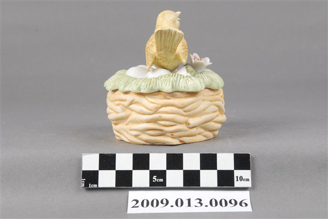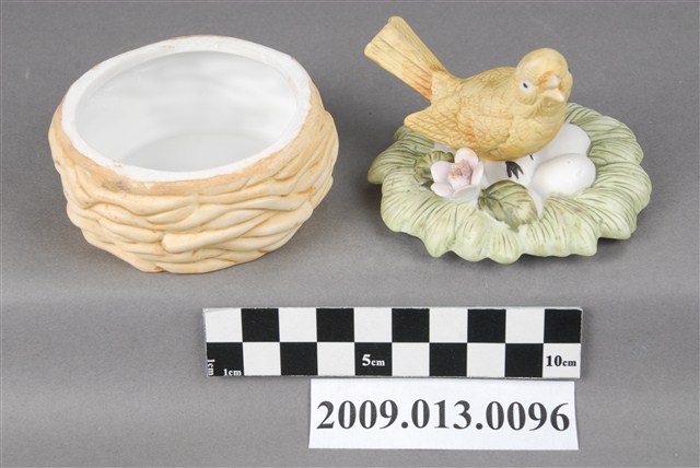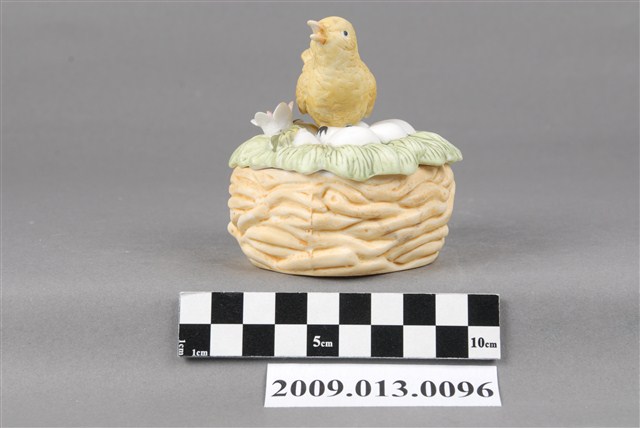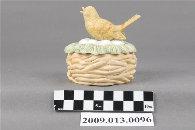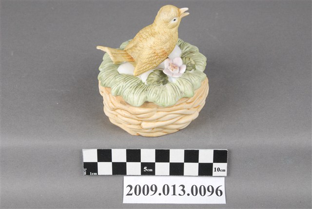 1.本件為彩繪黃雀鳥造型瓷蓋盒,以模製而成,容器為鳥窩造型,上蓋則有黃雀鳥孵蛋,造型頗富巧思。容器圓腹平底,外填淺褐色釉上彩作鳥窩,口緣無上釉,露出潔白的胎土。附蓋,蓋子為草堆造型,上填繪草綠色釉,頂部有一黃雀鳥作孵蛋的樣子。雀鳥旁貼飾一立體粉色花朵,與草堆及鳥相互映襯。黃雀鳥昂首向上,翅膀後收,尾曲翹起,模樣生動。 2.「丸利陶瓷公司」及「精華陶瓷公司」是苗栗地區生產裝飾陶瓷的工廠中最為人所知的兩間大工廠,其中「丸利」以重視製作品質及品管受到業界好評,「精華」則以自行開發產品樣式的能力而在市場上獲取競爭力。兩家工廠皆以運用釉上彩繪製瓷偶而知名。釉上彩繪的呈色豐富,可呈現鮮豔釉色,亦可表現較柔和的粉色調。不同於飲食用器有衛生與食用安全的疑慮,純為觀賞用的裝飾陶瓷以釉上彩繪居多,其優勢是能表現出更加豐富且鮮豔的釉色,因此亦是裝飾陶瓷主流的表現形式。