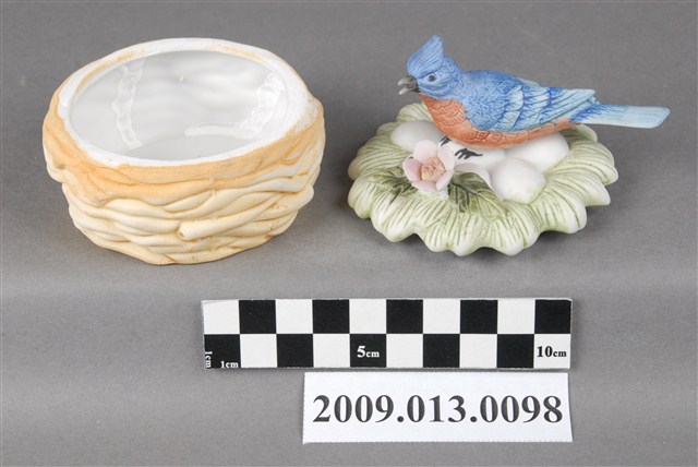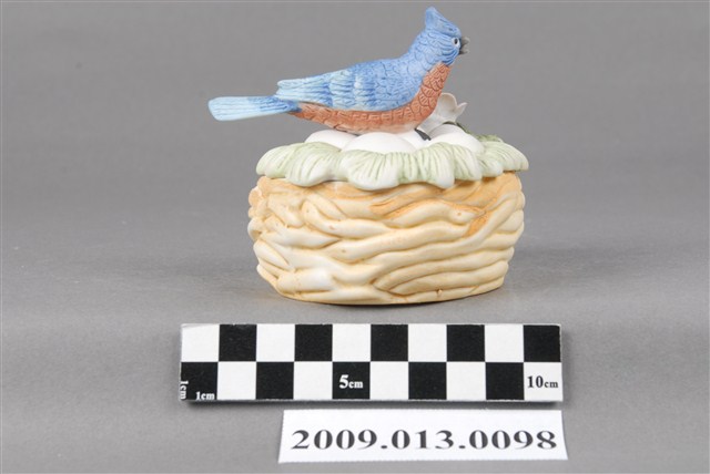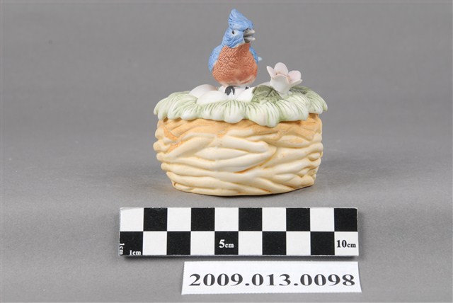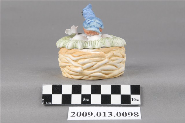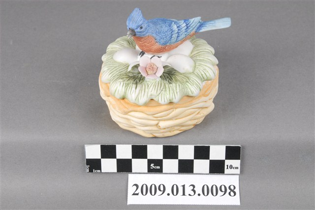 1.本件為彩繪藍雀鳥造型瓷蓋盒,以模製而成,容器為鳥窩造型,上蓋則為藍雀鳥孵蛋,造型頗富巧思。容器圓腹平底,外填淺褐色釉上彩作鳥窩,口緣無上釉,露出潔白的胎土。附蓋,蓋子為草堆造型,上填繪草綠色釉,頂部有一雀色鳥作孵蛋的樣子。鳥旁貼飾一立體粉色花朵,與草堆及鳥相互映襯。藍雀鳥以釉上彩填彩,藍色鳥首、灰色喙、紅褐身、淺藍色鳥尾,翅膀鳥羽依照羽毛層次,在淺藍色又上繪藍釉,繪彩相當細緻。鳥昂首向上,翅膀後收,尾曲翹起,模樣生動。 2.「丸利陶瓷公司」及「精華陶瓷公司」是苗栗地區生產裝飾陶瓷的工廠中最為人所知的兩間大工廠,其中「丸利」以重視製作品質及品管受到業界好評,「精華」則以自行開發產品樣式的能力而在市場上獲取競爭力。兩家工廠皆以運用釉上彩繪製瓷偶而知名。釉上彩繪的呈色豐富,可呈現鮮豔釉色,亦可表現較柔和的粉色調。不同於飲食用器有衛生與食用安全的疑慮,純為觀賞用的裝飾陶瓷以釉上彩繪居多,其優勢是能表現出更加豐富且鮮豔的釉色,因此亦是裝飾陶瓷主流的表現形式。