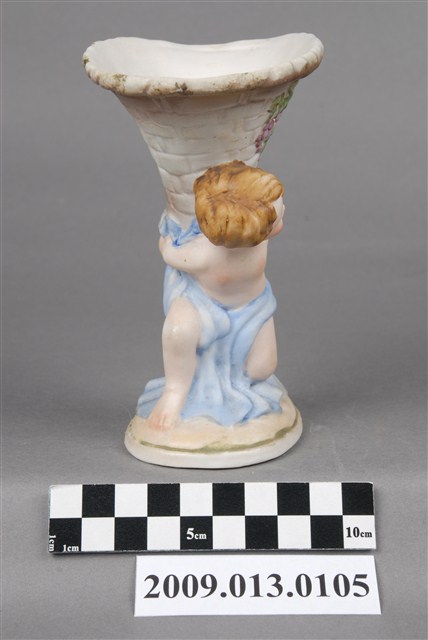 1.本件瓷燒牛角酒杯造型花瓶主要作擺插花朵之用,兼具觀賞擺飾性質,通身以潔白瓷土製作,採石膏模注漿灌模塑形,於表面施以粉彩釉料後燒製而成。本件花瓶作西洋風格,底座呈圓餅狀,上承男童裸身造型立柱,身體表面以藍色布匹包裹,其姿態作單膝下跪,雙手向後作背負狀,頭部斜偏一側。插花處以牛角為造型,尾端彎曲,口部呈喇叭口狀,表面裝飾為籐編造型,另以紫色葡萄與綠色葡萄葉點綴表面。2.裝飾陶瓷泛指不具實用功能、僅作擺飾之用的瓷器,又稱作「西洋藝術陶瓷」或「西洋玩偶」。裝飾陶瓷著重寫實細膩的手繪技巧、色彩鮮艷、精巧細緻供