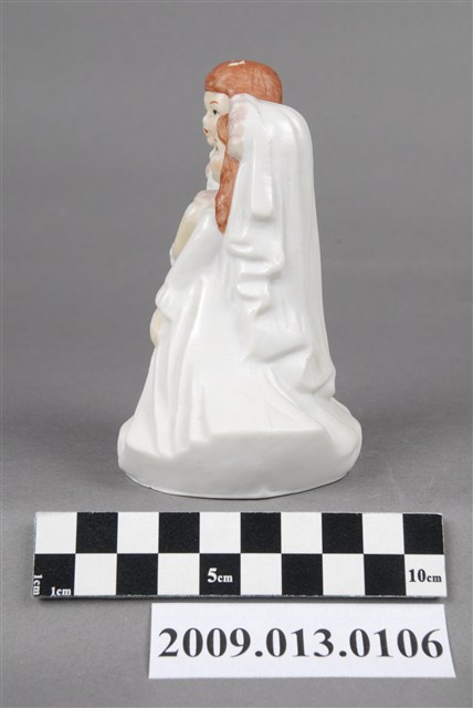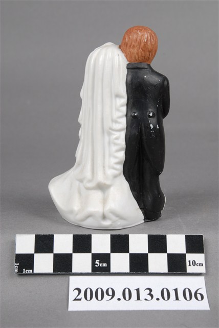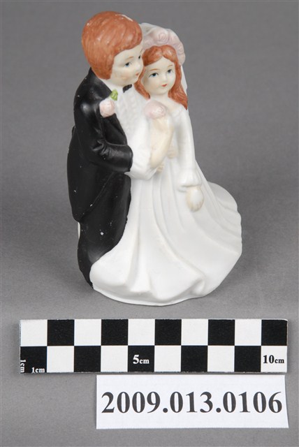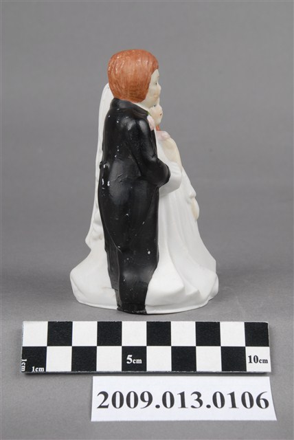 1.本件為彩繪新郎新娘雙人瓷偶,男士抱著仕女的腰部,仕女一手放在胸前一手自然垂下,兩人緊靠站立。男子著燕尾服,女子著西式婚紗,裙擺曳地,衣褶層層飄起,頗有動感。器以注漿模製成型,並繪釉彩。人物頭部與男子的燕尾服以釉上褐彩、皮膚色、粉色、及黑釉彩填繪裝飾。因兩人以同一模型製作,至底部僅略為區隔仕女的婚紗與男士腿部。頭髮及男子燕尾服的彩繪有零星剝落的跡象。2.臺灣生產裝飾陶瓷崛起於1970年代,由日本移轉生產技術而來。當時政府鼓勵產業外銷,促使裝飾陶瓷大量生產,也讓臺灣進軍國際,成為陶瓷外銷國。裝飾陶瓷既以外銷歐美為導向,面對的便是歐美地區禮品市場的需求,除了生產季節性禮品之外,苗栗地區的陶瓷工廠也生產這類婚禮使用的陶瓷娃娃,且款式多樣,有卡通造型,也有作優雅風格的紳士淑女類型。