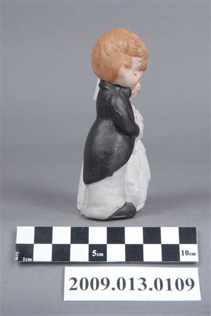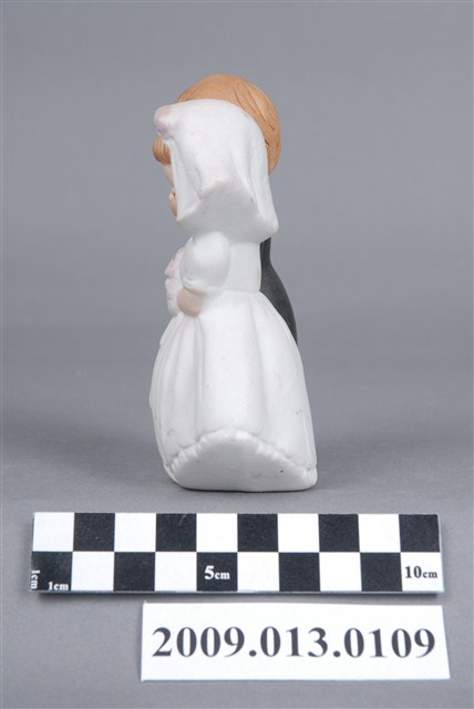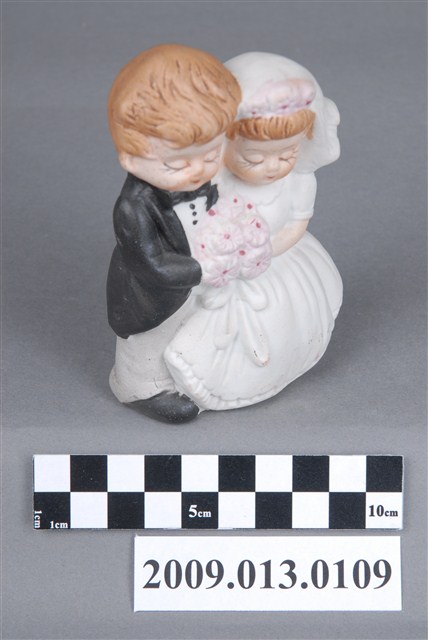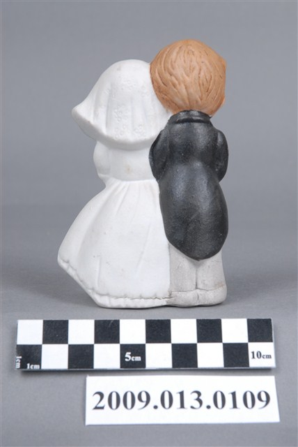 1.本件為彩繪新郎新娘閉眼雙人瓷偶,男士與仕女共同拿著粉色捧花,兩人閉眼並肩緊靠而立,模樣甜蜜。男士穿黑色西裝,灰色西裝褲,打著領結;女士戴頭紗,頭紗上有粉色花朵,著白色澎裙婚紗,裙擺有波浪與短直線刻飾,向外側飄動。2.臺灣生產裝飾陶瓷崛起於1970年代,由日本移轉生產技術而來。當時政府鼓勵產業外銷,促使裝飾陶瓷大量生產,也讓臺灣進軍國際,成為陶瓷外銷國。裝飾陶瓷既以外銷歐美為導向,面對的便是歐美地區禮品市場的需求,除了生產季節性禮品之外,苗栗地區的陶瓷工廠也生產這類婚禮使用的陶瓷娃娃,且款式多樣,有卡通造型,也有作優雅風格的紳士淑女類型。