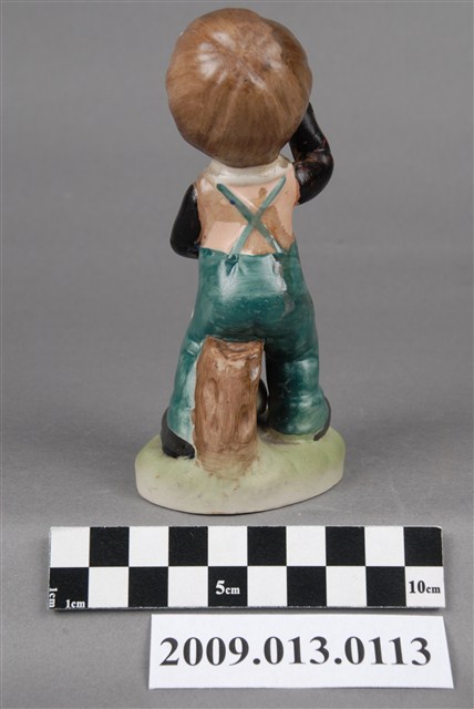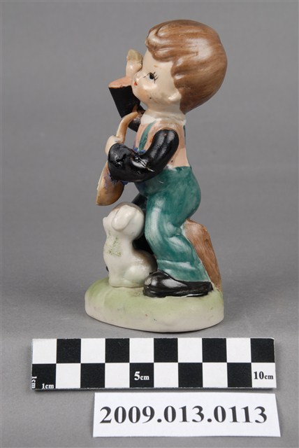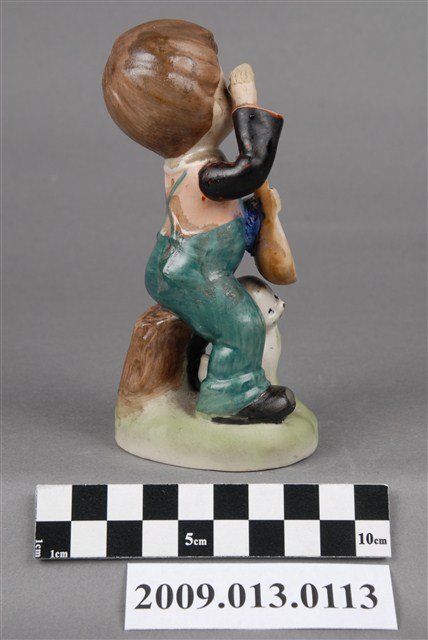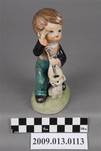 1.本件為彩繪曼陀林琴男孩與小狗瓷偶,男孩左手拿著背部隆起的曼陀林琴,右手上舉置於眉間作敬禮手勢,腳下一隻小白狗興奮上望。瓷偶施釉彩繪,釉色明豔。繪顏彩,捕捉男孩活潑的表情,與動作搭配之下,呈現整體活潑淘氣的氛圍。因瓷偶造型複雜,男孩右手手肘轉折處、小狗與曼陀林琴的交界面與小狗的背部等較難繪彩的地方未施釉彩,露出偏紅色的胎土。2.日治時代發展出的窯業發展,除了鶯歌和北投之外,亦有日人發現良質陶土而到苗栗地區設窯燒陶。苗栗的陶土土質多鐵,陶胚色深,較不合適用來製作碗盤器皿,因此多生產釀酒甕等工廠用器。戰後的苗栗窯廠除了延續日本時代生產酒甕、花盆的傳統之外,也製作浮雕、瓷塑等裝飾用陶瓷。1970年代,苗栗地區窯廠興起製作裝飾陶瓷的風氣,最興盛的時期出現了上百家專做西洋玩偶的工廠,成為臺灣其他地區未有的特殊產業。