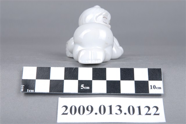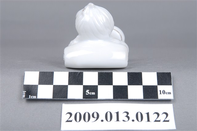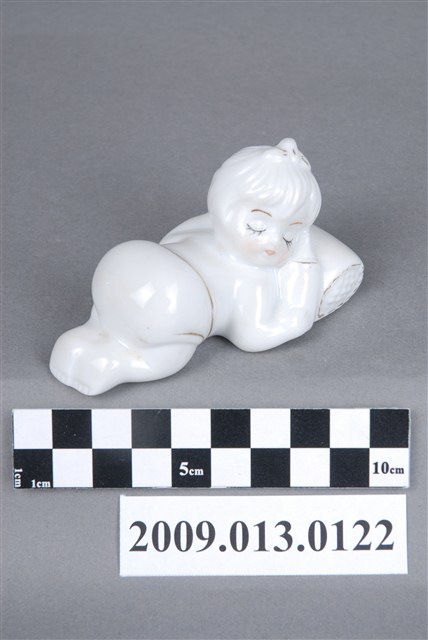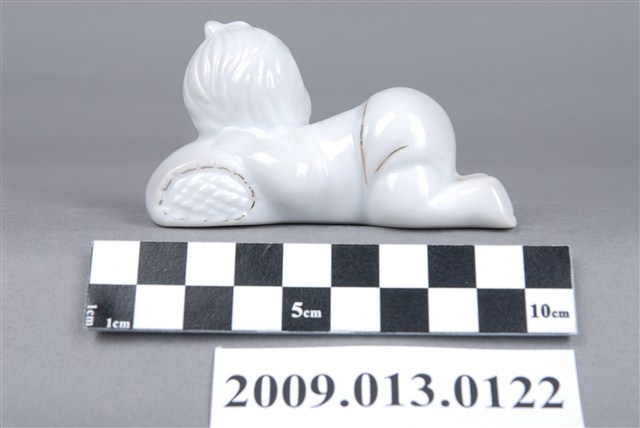 1.本件是苗栗地區產製之描金沈睡嬰兒陶瓷玩偶,孩童雙腳併攏,一手拿著奶瓶,翹著屁股,趴在枕頭上安詳沈睡。全器施釉,釉面光滑潔白,其上手繪顏彩及金彩。嬰兒的顏彩以細筆描繪,五官對稱精細;頭飾、奶瓶瓶蓋、尿布的描金,與枕頭兩側的短曲線描金邊飾呈現了纖細的線條。整體施釉及繪彩方式讓玩偶顯得十分精緻。2.西洋玩偶中,除了顯現鮮豔色彩的釉上彩與呈現柔和色調的釉下彩兩大類別之外,亦有謹以白瓷,或施厚白色釉做為底色的瓷偶。這種表現方式能呈現出有如大理石雕像般典雅精緻的效果。