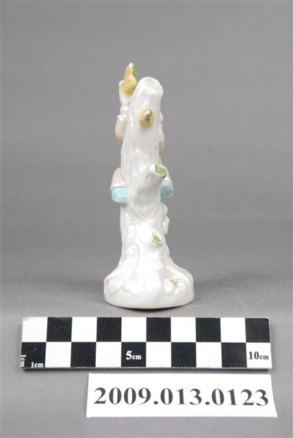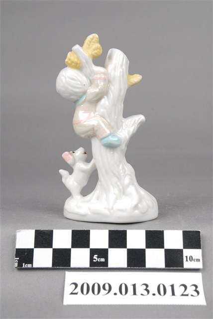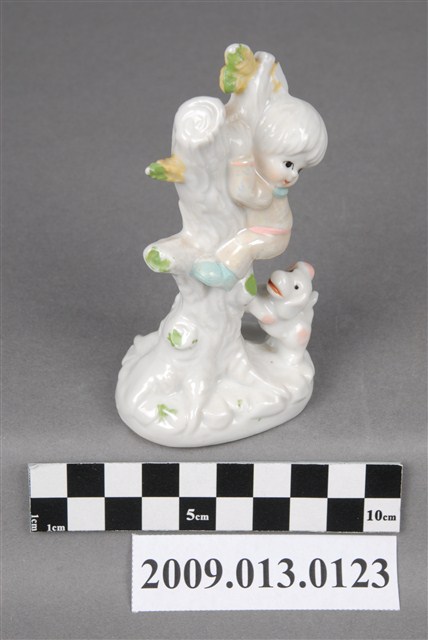 1.本件為珠光釉彩孩童與小狗陶瓷玩偶,孩童上樹抱著樹幹,腳下則有一隻小狗興奮欲撲上嘻笑遊戲,模樣十分淘氣。器施釉,男孩身上服飾施珠光釉,展現特有的珍珠光澤,讓作品更富裝飾性。樹幹、孩童與小狗亦略以手繪粉紅色、草綠色、鵝黃與粉藍色釉上彩,用色柔和。整體造型與設色皆顯露十足的活潑與稚氣。2.臺灣生產裝飾陶瓷崛起於1970年代,由日本移轉生產技術而來。當時政府鼓勵產業外銷,促使裝飾陶瓷大量生產,也讓臺灣進軍國際,成為陶瓷外銷國之一。而在裝飾陶瓷的諸多種類中,苗栗地區以生產動物像及西洋人偶為大宗,尤其以公館鄉最為著名。1970年代為苗栗盛產裝飾陶瓷的黃金時代,但惜於1990年間,隨著工廠外移而趨於沒落。
