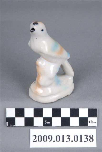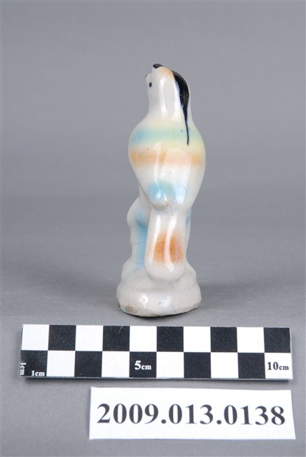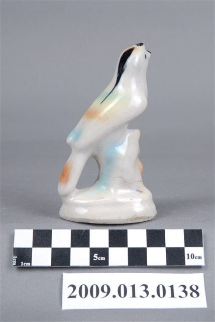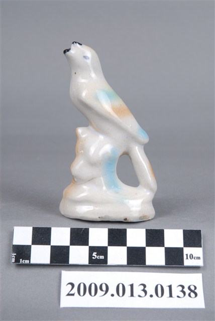 1.本件臺灣鶯歌窯鳥型裝飾陶瓷主要作觀賞擺飾用途,通身以瓷土製作,採石膏模注漿灌模塑形,於表面施以白色厚釉,另以藍、橘、黑色釉料點綴。本件裝飾陶瓷以橢圓形為底座,上接樹幹造形短柱,主體作鳥類造型,其姿態休憩於樹幹之上,頭部抬起,尾部羽毛向下與底座相連。2.裝飾陶瓷泛指不具實用功能、僅作擺飾之用的瓷器,又稱作「西洋藝術陶瓷」或「西洋玩偶」。裝飾陶瓷著重寫實細膩的手繪技巧、色彩鮮艷、精巧細緻供人賞玩收藏,產品造形種類包括小玩偶、動物、卡通塑像、花卉、瓶飾等,以歐、美、日風格的瓷偶居多。由於裝飾陶瓷的產品精緻