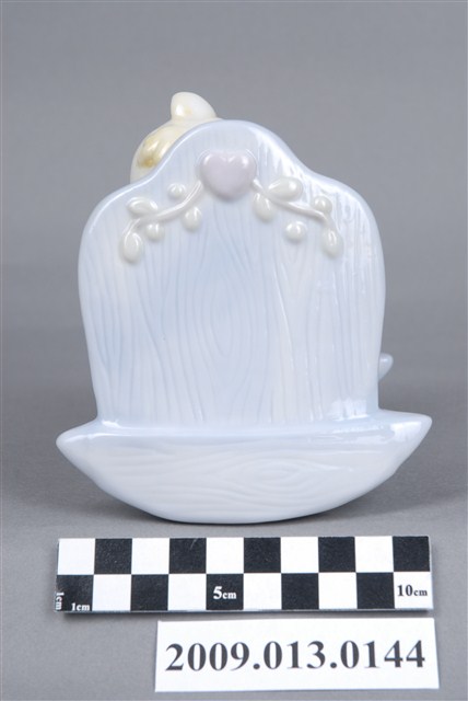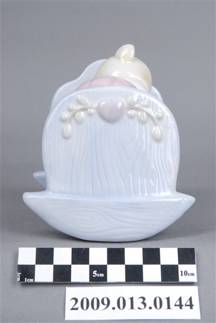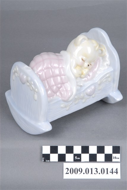 1.本件為彩繪搖籃小熊陶瓷玩偶,黃色小熊蓋著棉被,側躺在搖籃上靜謐沈睡。玩偶為釉下彩,釉面晶瑩,富有光澤,釉色以淺粉色調為主。瓷偶以注漿模製而成,床鋪底座為兩個半圓體,實際推動搖籃,半圓體底座便會搖動,達到了觀賞與把玩兼具的價值。2.苗栗地區的裝飾陶瓷產業能夠從零瞬間興盛起來,有賴於引入日本人成套的原料供給、生產技術與行銷管理制度。最早成立裝飾陶瓷工廠的丸利、精華、聯美及東方,皆有聘請日本技師來臺指導員工,或是派遣員工赴日進修,學習生產技術。運用日本技術生產的陶瓷產品受到歐美地區的好評,也因此訂單源源不絕,產業在發展不久後便得以擴大規模,在短短三、四年間苗栗的裝飾陶瓷工廠成功擴展到了三百多家。而在眾多陶瓷工廠中,以「丸利陶瓷公司」沿用日本生產模式,秉持優良製作品質及嚴格的品管最為著名。