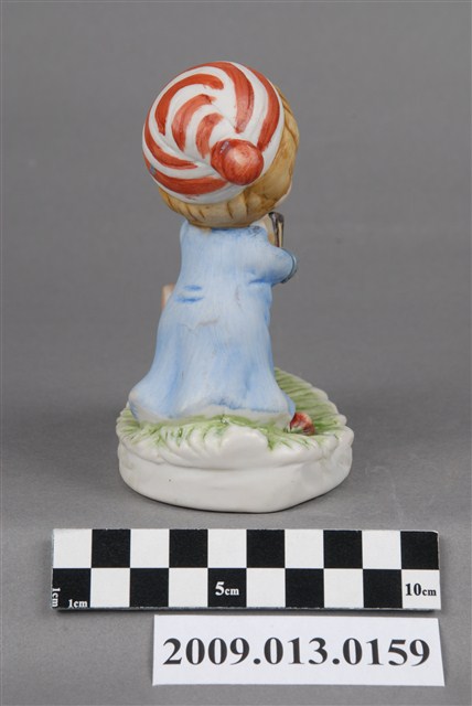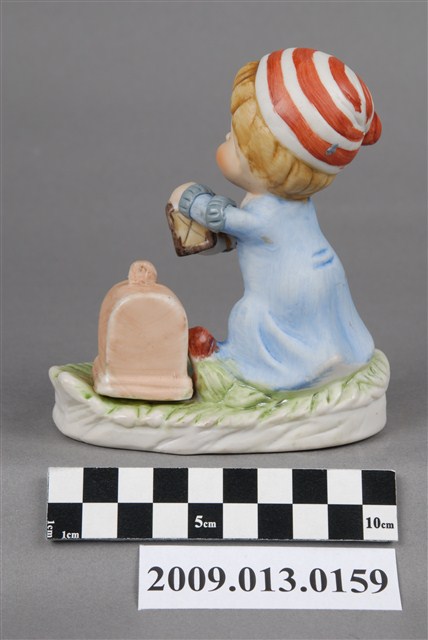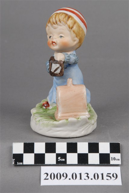 1.本件是彩繪男孩與時鐘陶瓷玩偶,男孩戴著紅白相間的軟帽,身穿藍色長睡袍,長袍層層垂墜,頗有柔軟的感覺。以釉上彩繪填彩,顏色鮮明。男孩頭髮、衣折及底座的草皮刻飾有積釉痕跡,顯現較深的釉色。此外,男孩的眼珠特別以亮面的釉彩描繪,使眼睛更為明亮,具有引人注目的效果。2.臺灣生產裝飾陶瓷崛起於1970年代,由日本移轉生產技術而來。當時政府鼓勵產業外銷,促使裝飾陶瓷大量生產,也讓臺灣進軍國際,成為陶瓷外銷國。裝飾陶瓷既以外銷歐美為導向,面對的便是歐美地區禮品市場的需求,苗栗地區有不少工廠生產的陶瓷玩偶是直接沿用或模仿歐美裝飾陶瓷的設計。如此的生產方針雖然能瞬間促進產業經濟的發展,但也容易被取代,1990年代苗栗陶瓷工廠快速沒落的原因有一部分即是緣於此。
