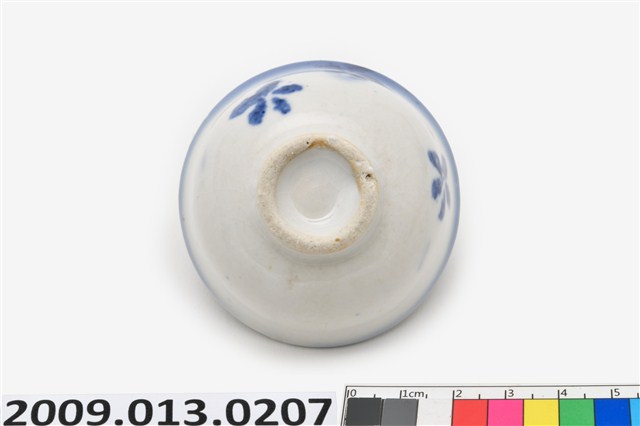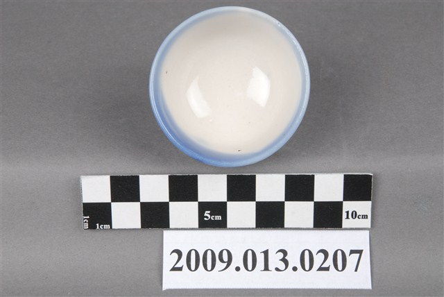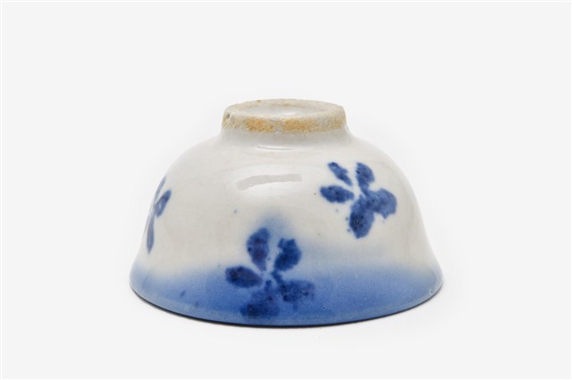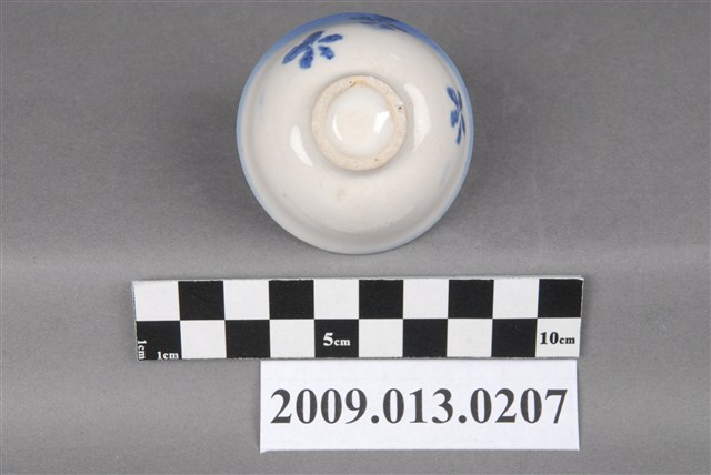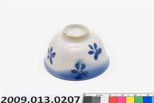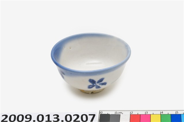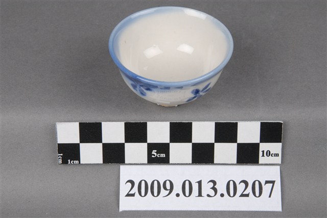 器型似一般日本清酒小盅(杯),但杯體比例明顯略高,杯壁相對厚很多。圓唇略外翻(日文「端反」),器形微微外侈,圓弧折腹。石膏壓模製作,通體施略泛白色的透明釉,釉面明顯比日治時期薄而均勻,足心滿釉,足尖抹釉。坯體潔白,略見氧化鐵團點狀黑褐色斑,但胚土瓷化程度低。杯唇以吹繪方式裝飾一圈鈷藍色帶,杯身繪三朵小花,釉下青花彩。