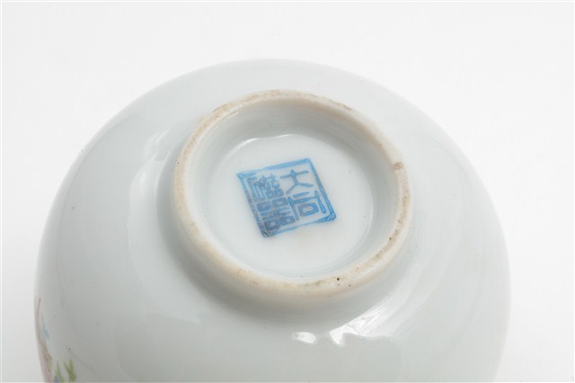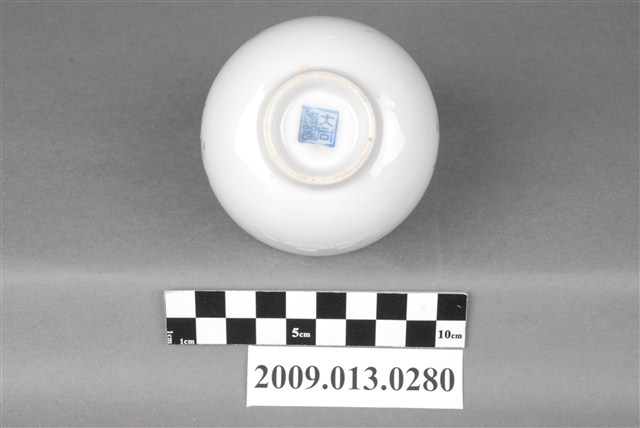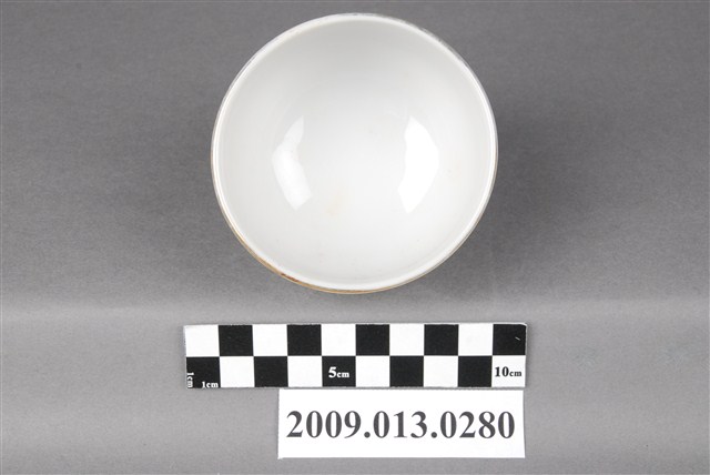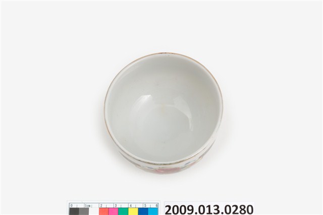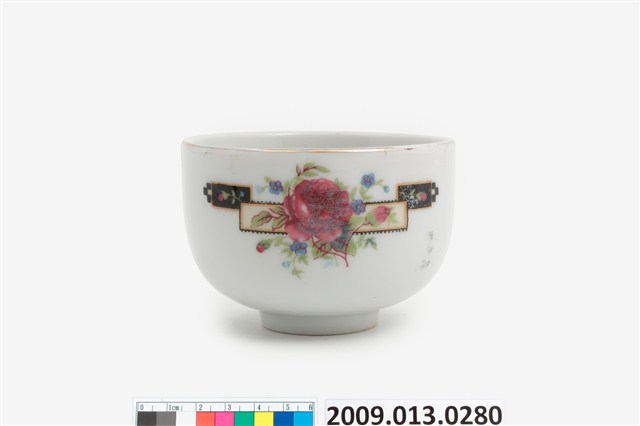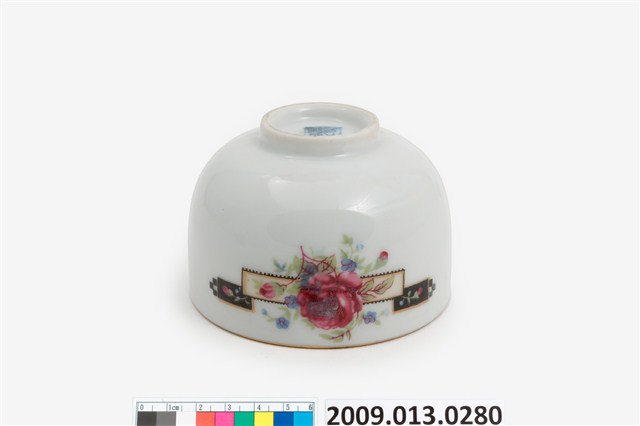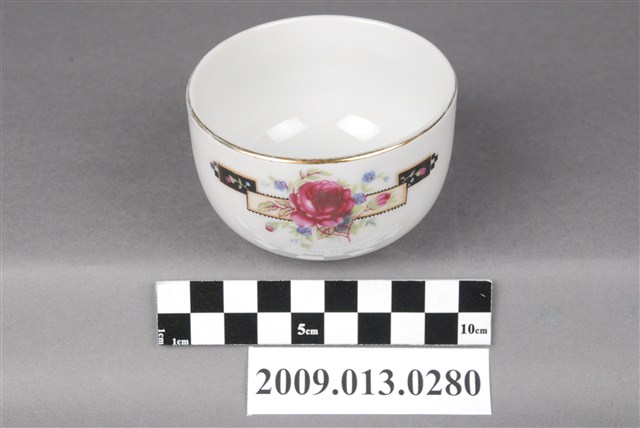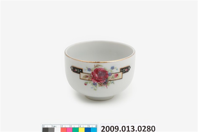 臺北大同公司瓷器。器型屬於常見的圓腹矮茶杯,比日治時期的湯吞型體高。器型腹體下部圓弧折腹,上部器壁直上,直口,帶矮圈足,壓模製作。坯體潔白清脆,燒製火候高度,通體施釉,釉色透明。杯口飾描金線圈紋,杯底款印「大同磁器」,杯身釉上轉印玫瑰花葉紋,色彩飽滿,膠板印刷精細,應是晚近的當代大量生產工藝品。