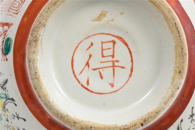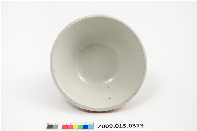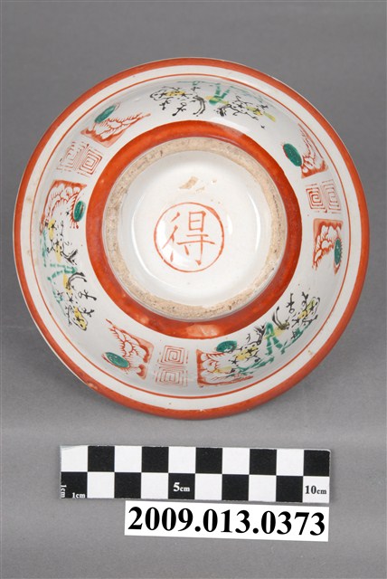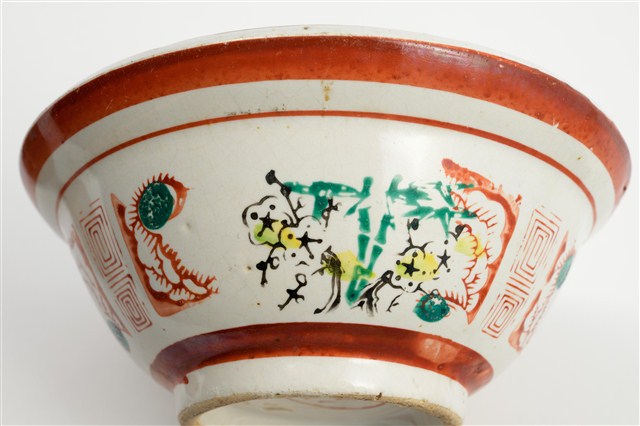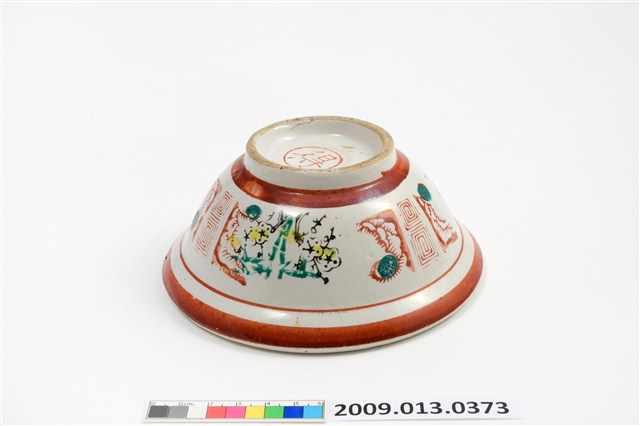 戰後初期臺灣餐具流行彩瓷的年代,鶯歌地區製作,專門供應小吃攤使用,業者稱為「生意碗」的小吃碗。碗的形制極具特色,通常坯體厚重,大撇口碗折沿口邊寬寬大大的,碗下腹腰線收縮,底部狹窄,碗的腹壁下細上粗,視覺上看似食物容納份量多,實則盛裝有限。許多小吃如肉圓、滷肉飯、米苔目、刨冰等店家都愛用的餐碗。該件作品印花裝飾華麗,色彩鮮豔。全器滿釉,圈足刮釉露胎,胎體呈米黃色,內外壁皆施以白釉,內器壁素面無紋,外碗壁以雙回紋等距離分隔,裝飾三組窗花紋,窗花開光內以紅、綠、黑彩佈置中間的竹子紋與梅花紋,左右輔以旭日東升的太陽光芒。外底心有「得」字商號。
