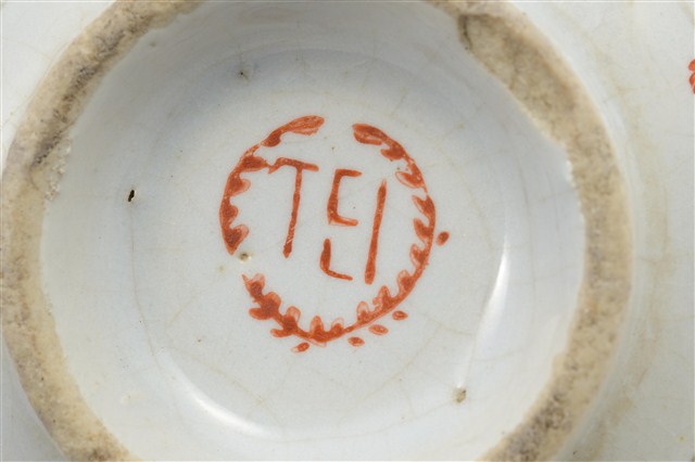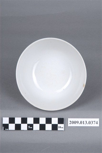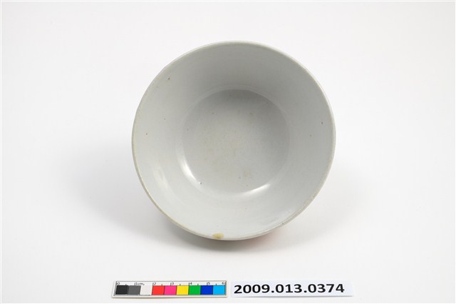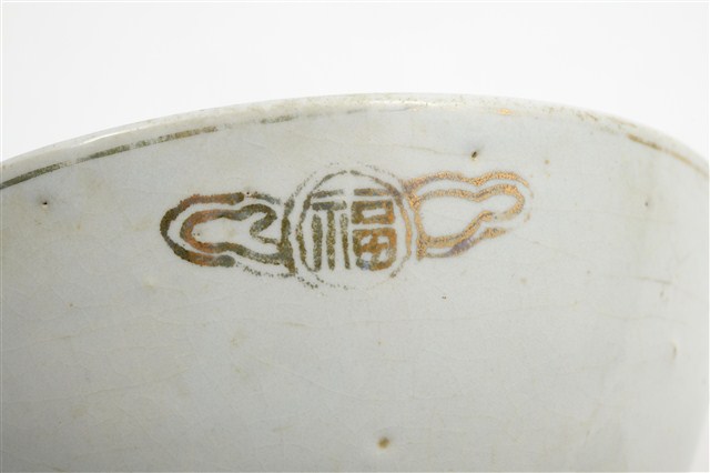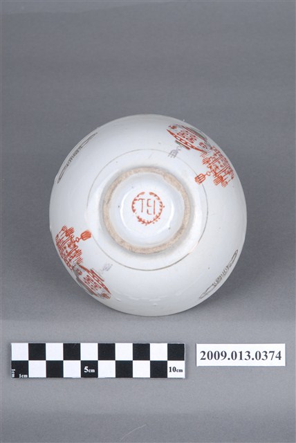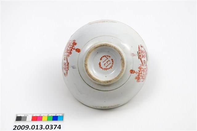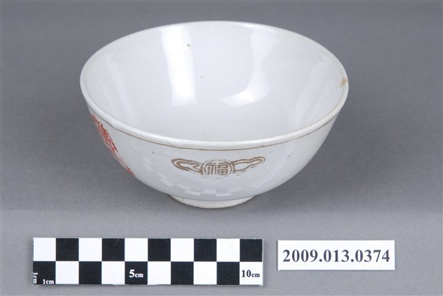 碗型屬於最常見華人飯碗。碗型腹體下部圓、上部直,器壁在底部向上弧轉,帶矮圈。坯體灰黃,石陶器質地,燒製溫度低,質粗。壓模製作,器底可見壓模痕跡。通體施白濁釉,外底心滿釉,足尖刮釉。碗體對稱於釉上轉印三組彩繪紋樣。一是宮燈圖案,描金勾勒燈形,燈心紅彩囍字,旁有紅彩福祿壽宮燈,外圍飾以金彩如意祥雲福字。同型轉印紋樣的製品,也件於本批器物編號2009.013.0277的茶杯,轉印紋飾幾乎雷同。該件茶杯製品曾見有杯底印款"Tombang Toki",據此推斷本件印款應為「T.B」,研判是臺北地區窯製品。本件也是以登錄號2009.013.0275之高檔附蓋茶杯為仿製對象,但精細程度也頗見差距。從胎體推斷本件應是戰後初期,稍早於上述登錄號2009.013.0277的茶杯。此三件製品,可以觀察到臺灣陶瓷產業的發展過程和脈絡,相當有趣。