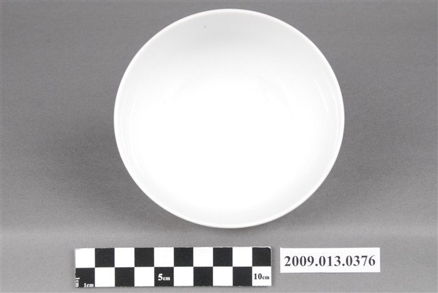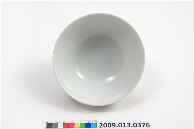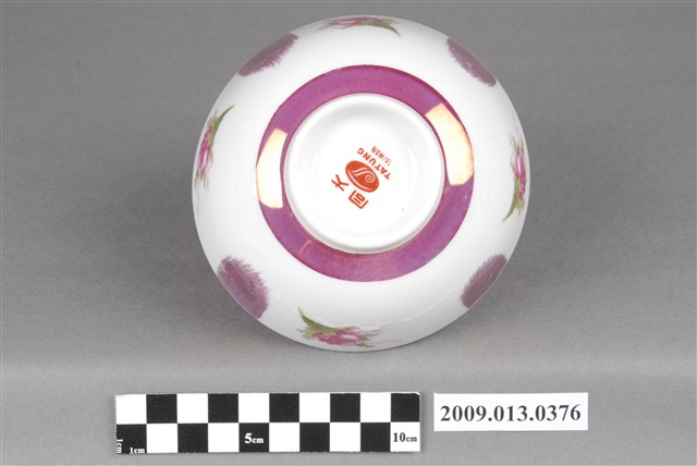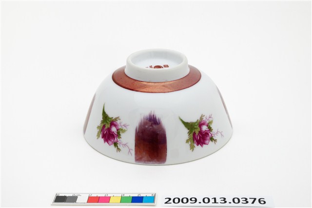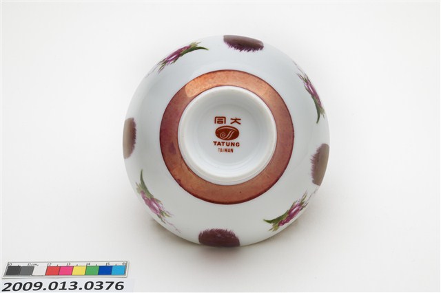 這是戰後流行的彩飾瓷技術的一大突破,作為彩繪基底的白瓷,已達西方定義標準的瓷器(porcelain)。敞口、圓弧腹、帶圈足碗,造型已是現代飯碗形制。全器滿釉,圈足刮釉露胎,胎質堅硬細緻。碗內壁素面無紋,光亮潔淨,碗外壁圈足上方裝飾一圈寬邊紫金釉,碗壁環身等距離刷飾四組紫金釉色塊,幾何圖案設計簡潔有力,頗具有現代化的抽象美感。紫金閃光釉為低溫釉彩,具有金屬般的光澤。紫金閃光釉色塊之間轉印貼飾四束盛開的玫瑰花,粉紅花瓣漸層色澤細膩動人。碗底有紅彩「大同TA TUNG Taiwan」商標。