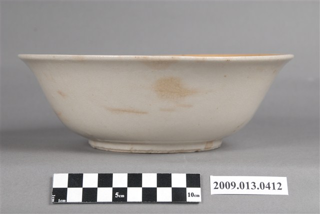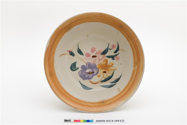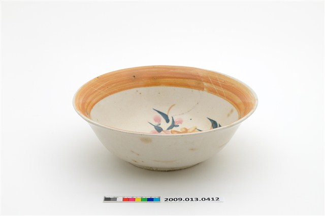 俗稱「大碗公」的大型深腹碗餐具。侈口、弧壁、帶圈足碗,尺寸寬約21.8公分,高約7.5公分,是比較大型的湯碗。模製成形,長石釉上繪以彩釉裝飾,再高溫燒製而成。全器除圈足之外滿釉,圈足刮釉露胎。碗外壁素面無紋,有幾處污漬使用痕,碗內壁口緣裝飾一道寬邊金黃色釉彩,意圖模擬黃閃光釉效果,碗內壁以粉紅、紫、綠、金黃彩料,寫意筆繪折枝花卉紋,襯以白色底釉,猶如在白色畫布上繪畫。根據胎釉與裝飾特徵判斷,為北部地區鶯歌等窯製品,其繽紛的色彩引領流行,是戰後初期1950年代至1960年代廣受歡迎的食器。
