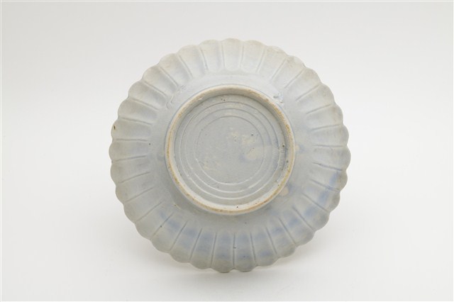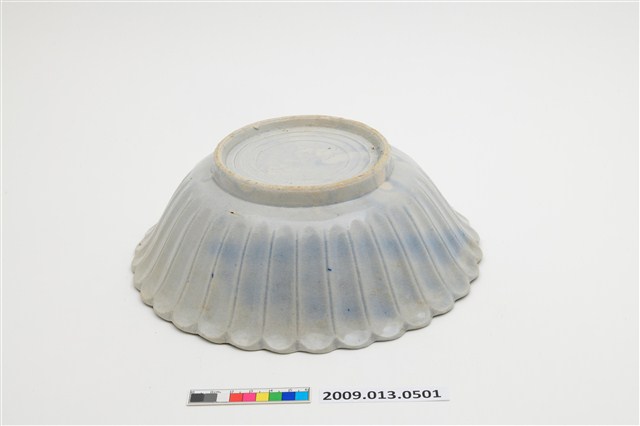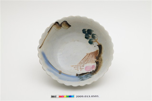 戰後初期家庭常見之餐飲用器。敞口、弧壁、碗底較淺而寬,帶圈足大碗,以模具成形,並於白色長石釉上裝飾彩釉之後,高溫燒成。形制上,口緣做成菱瓣形,共三十瓣花口,碗壁亦模印一道一道的花瓣稜脊,整個碗彷彿一朵盛開的花兒,外底心特意壓模出數道細刻弦紋,增加造型變化。裸足露灰白胎,足內沾黏少量窯沙,除圈足之外全器滿釉,內外施罩白釉。碗外壁素面無紋,一側帶有淺淺的淡藍色釉,應是不經意的偶然效果。碗心並用彩繪與印花兩種技法,以青、綠、粉紅、褐彩顏料描寫孤舟、老樹、野屋、遠山風景,令人連想到老藤閒不住、條衣流水樣、色染遠山青這些意境優美的詩文。孤舟、竹籬、房舍與綠樹採用印花裝飾技法,遠山、近水與枯木則以純熟筆法寫就。整體畫面無論是構圖設計、流暢筆法或色彩配置,皆搭配合宜,賞心悅目。1960年代北部地區鶯歌等窯製品。