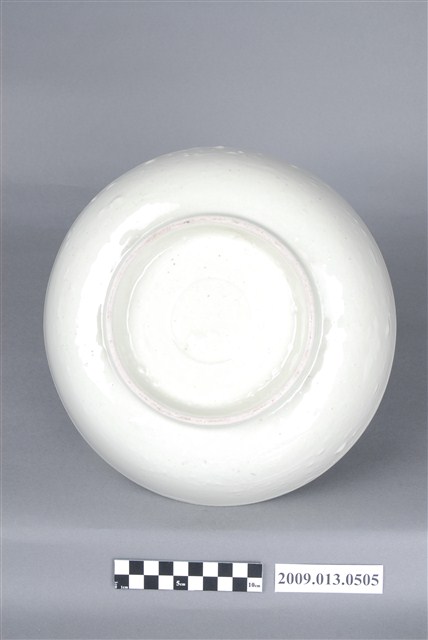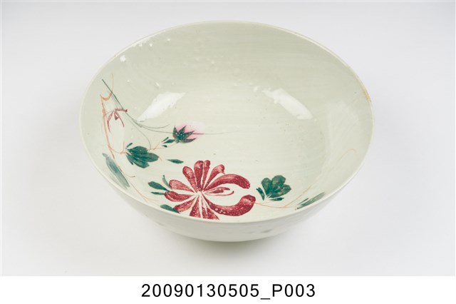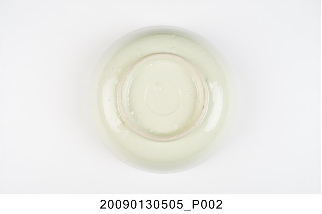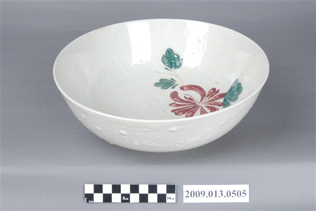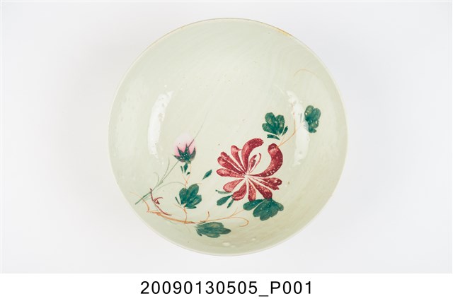 1.淡綠釉印花菊花紋碗,以模製成形,敞口,弧壁下收,圓腹,碗底寬大,底有圈足。全器施淡綠釉,足底露胎,碗內外壁有皆有顆粒狀凸起。碗外壁素面無紋,碗底心壓模同心圓造型,主要紋飾繪於碗內壁一側,以紅、綠彩蓋印花卉紋,並以褐彩手繪勾勒細枝,一朵大紅菊花盛開,兩旁襯綠色枝葉,對比色彩烘托出花朵的艷麗。2.鶯歌陶業發展大約始於清朝嘉慶年間,多以厚重的粗陶器為主,直到1937年中日戰爭爆發,陶瓷器取得不易,有北投工人轉往鶯歌發展,帶動鶯歌製碗業的發展。花卉紋為鶯歌碗盤上常見的紋飾之一,早期碗盤多只用青花裝飾,約1950年代業者開始使用粉紅彩搭配青花,之後又出現綠色、褐色等其他顏色的著色劑,發展出釉下多彩,使裝飾色彩應用更加多元。