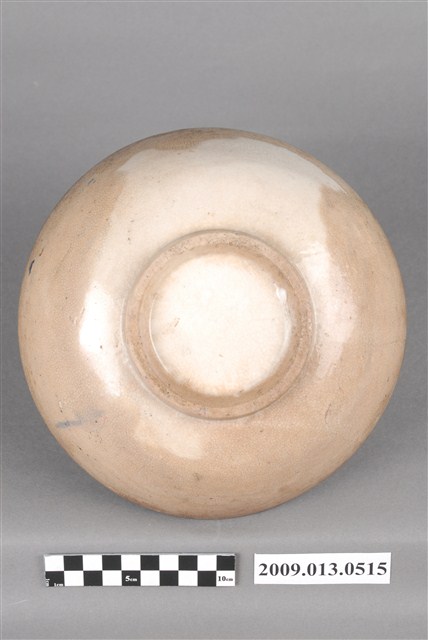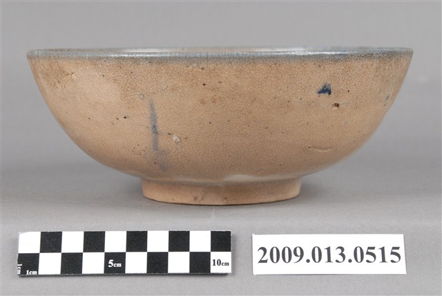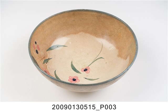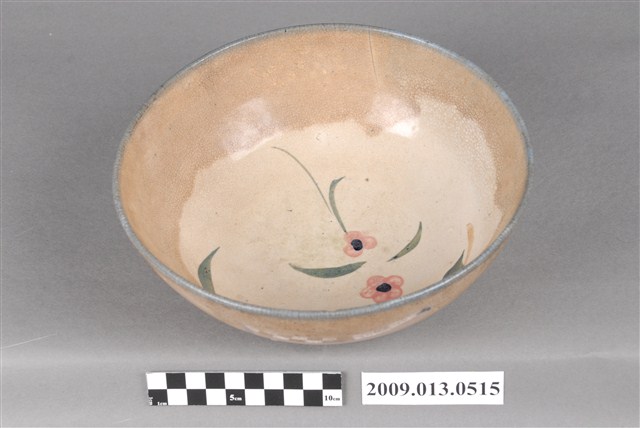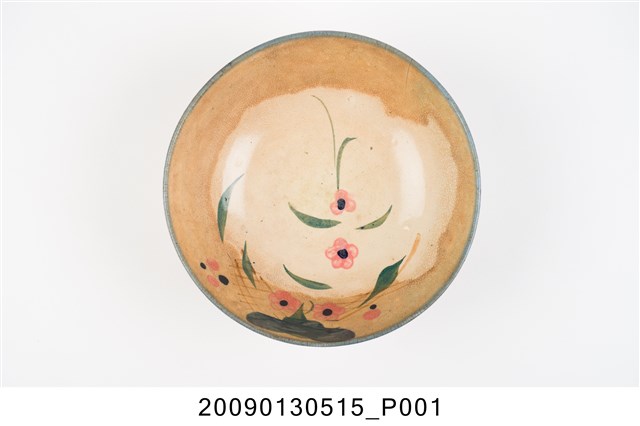 1.彩繪花卉紋碗,以模製成形,敞口,弧壁下收,圓腹,碗底寬大,底有圈足。全器施白釉,足底露胎,口沿施塗一圈青花鈷料裝飾,碗內外壁釉面佈滿細密開片,上半部有大片褐色汙漬。碗外壁素面無紋,有兩個青花斑點,應是施作時不小心沾到釉料所致,碗內壁以粉紅、黛綠釉彩手繪花卉紋飾,青花點綴花芯,襯以褐色細枝,花卉自內壁一側延伸至碗心。2.鶯歌陶業發展大約始於清朝嘉慶年間,多以厚重的粗陶器為主,直到1937年中日戰爭爆發,陶瓷器取得不易,有北投工人轉往鶯歌發展,帶動鶯歌製碗業的發展。早期碗盤多只用青花裝飾,約1950年代業者開始使用粉紅彩搭配青花,之後又出現綠色、褐色等其他顏色的著色劑,發展出釉下多彩,使裝飾色彩應用更加多元。