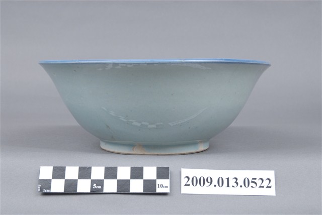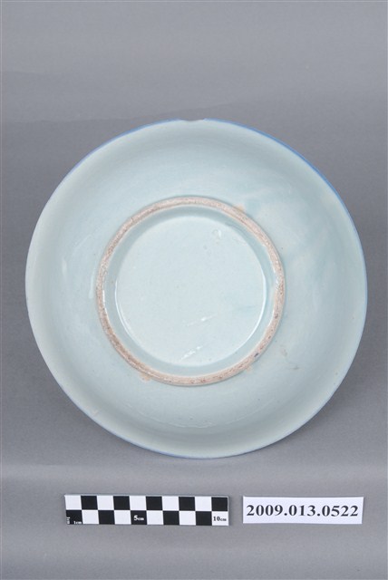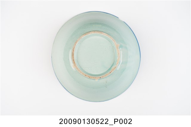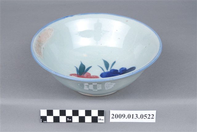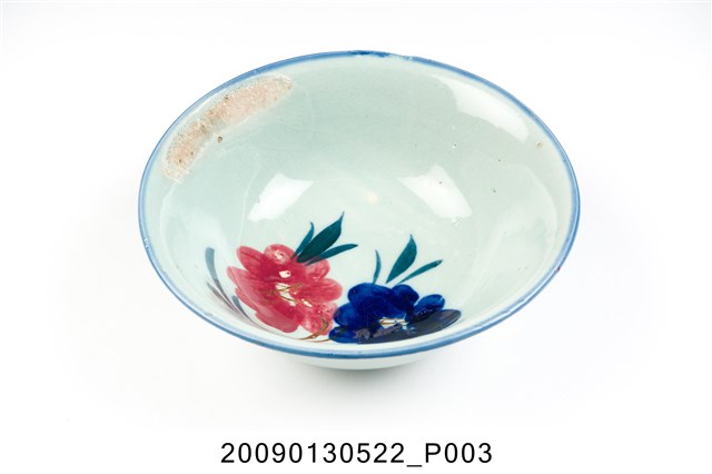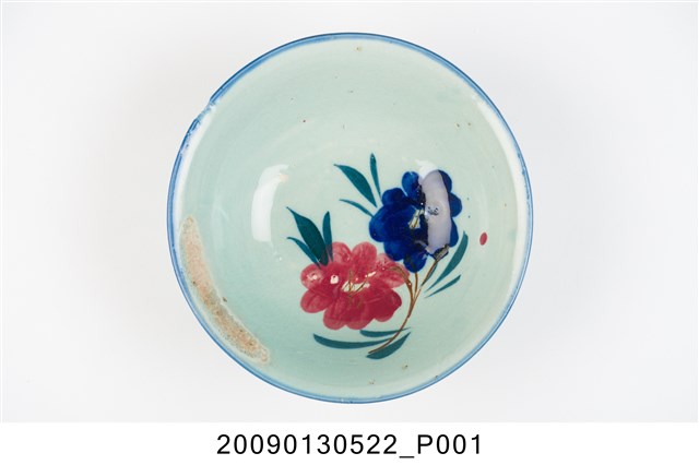 1.淡藍釉彩繪花卉紋碗,以模製成形,撇口,扁尖唇,弧壁下收,圓腹,底有圈足。全器施淡藍釉,足底露胎,內壁口緣有一長條狀露胎,口沿有一磕碰缺角。口沿施塗一圈青花鈷料裝飾,碗外壁素面無紋,主要紋飾繪於碗心,採沒骨技法描繪折枝花卉紋,青花和紅彩兩朵盛開的大花相互爭豔,旁襯綠葉和褐色細枝,春意盎然。2.鶯歌陶業發展大約始於清朝嘉慶年間,多以厚重的粗陶器為主,直到1937年中日戰爭爆發,陶瓷器取得不易,有北投工人轉往鶯歌發展,帶動鶯歌製碗業的發展。早期碗盤多只用青花裝飾,約1950年代業者開始使用粉紅彩搭配青花,之後又出現綠色、褐色等其他顏色的著色劑,發展出釉下多彩,使裝飾色彩應用更加多元。