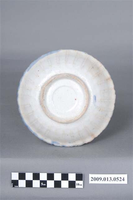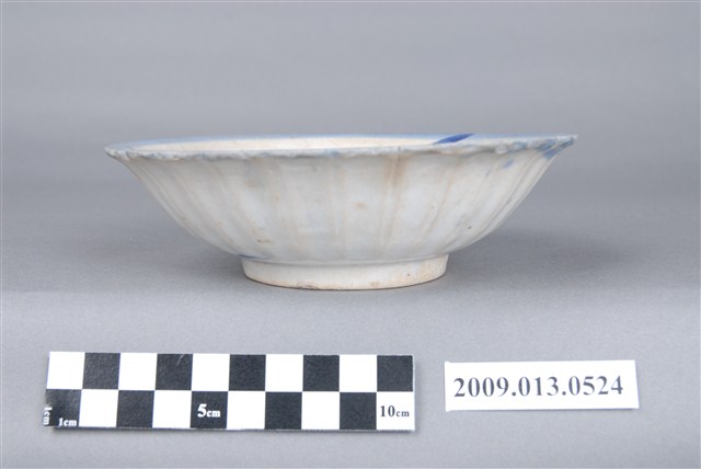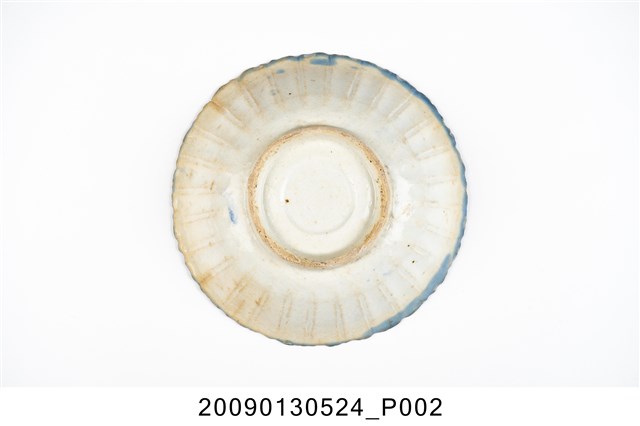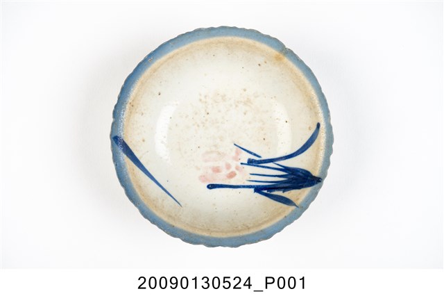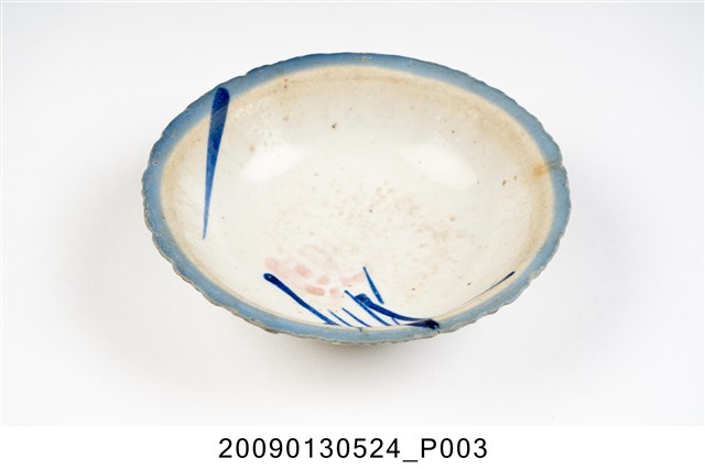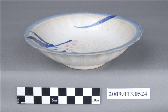1.青花粉紅彩花葉紋菱花口碗,以模製成形,撇口,折沿,淺弧壁下收,圓腹,底有圈足,口沿與碗外壁壓模裝飾菱花瓣造型,碗底心壓模同心圓形造型,增添變化。全器施白釉,足底露胎,折沿處施塗一圈青花鈷料裝飾,主要紋飾繪於碗內壁一側,以1950年代流行的青花粉紅彩描繪花葉紋飾,上方再隨意畫出一筆青花長葉片,其餘面積大片留白。碗的表面有黃褐色汙漬痕,碗心有明顯氣孔,口沿處有一直裂紋。2.鶯歌陶業發展大約始於清朝嘉慶年間,多以厚重的粗陶器為主,直到1937年中日戰爭爆發,陶瓷器取得不易,有北投工人轉往鶯歌發展,帶動鶯歌製碗業的發展。早期碗盤多只用青花裝飾,約1950年代業者開始使用粉紅彩搭配青花,之後又出現綠色、褐色等其他顏色的著色劑,發展出釉下多彩,使裝飾色彩應用更加多元。此碗口沿特意做成花口邊,頗具特色,葵花、菱花、荷花都是常見的花口造型。
