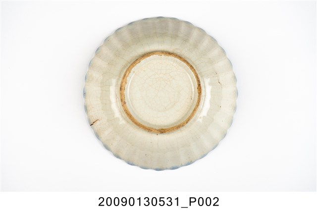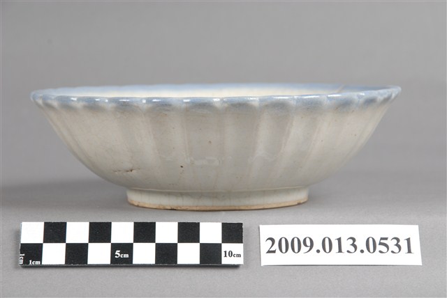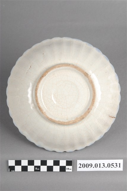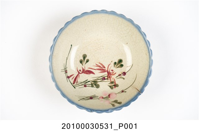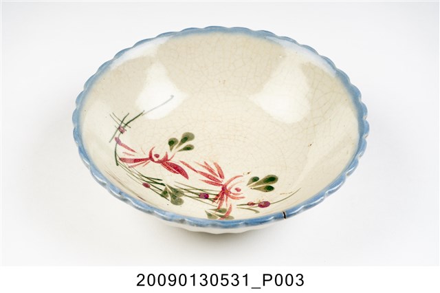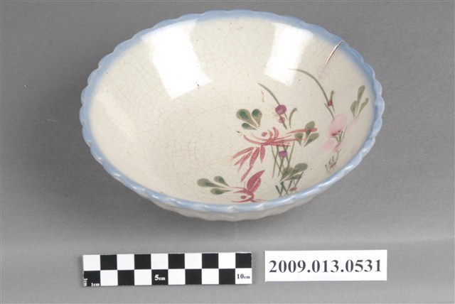 1.彩繪花卉紋菱花口碗,以模製成形,口微外撇,弧壁下收,圓腹,底有圈足,口沿與碗外壁壓模裝飾菱花瓣造型,碗底心依稀可見壓模同心圓形造型。全器施白釉,足底露胎,碗內外壁釉面開片,口沿有一道明顯直裂縫。口沿施塗一圈青花鈷料裝飾,主要紋飾繪於碗內壁一側,採沒骨技法描繪折枝花卉紋,紅色的花朵應為菊花,粉色為五瓣梅花,周圍襯以黛綠色枝葉,對比色彩更為突顯花朵的艷麗。2.鶯歌陶業發展大約始於清朝嘉慶年間,多以厚重的粗陶器為主,直到1937年中日戰爭爆發,陶瓷器取得不易,有北投工人轉往鶯歌發展,帶動鶯歌製碗業的發展。花卉紋為鶯歌碗盤上常見的紋飾之一,早期碗盤多只用青花裝飾,約1950年代業者開始使用粉紅彩搭配青花,之後又出現綠色、褐色等其他顏色的著色劑,發展出釉下多彩,使裝飾色彩應用更加多元。此碗口沿特意做成花口邊,頗具特色,葵花、菱花、荷花都是常見的花口造型。