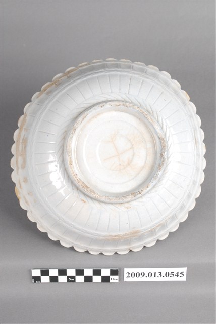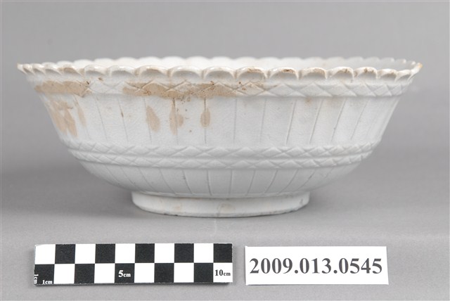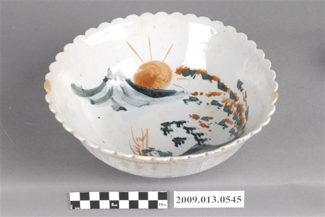 1.彩繪夕陽山水紋菱花口碗,以模製成形,敞口,斜壁下收,圓腹,底有圈足,口沿作菱花造型,碗外壁以壓模裝飾雙層直線紋對應口沿菱花瓣造型,口沿下方裝飾一圈菱格紋,腹部中段裝飾兩圈菱格紋,圈足周圍裝飾一圈斜線紋,碗底心亦壓模兩圈同心圓形造型,增添變化。全器施白釉,碗內採手繪技法,以藍、綠、褐、黑等釉彩裝飾夕陽山水紋飾,遠方的山脈似富士山的形狀。2.北投自清朝即有窯業發展,日治時代受到重視,「北投窯業株式會社」為當時臺灣規模最大的陶瓷工廠,二戰後由政府接收,仍是全臺規模第一。北投陶瓷受到日本影響很深,許多裝飾題材、技法也從日本引進臺灣,山水紋飾即是其中一個例子。此碗中的錐形山脈和山頂白雪覆蓋,似日本富士山形,應為模仿日本碗盤中的富士山海景紋而來。