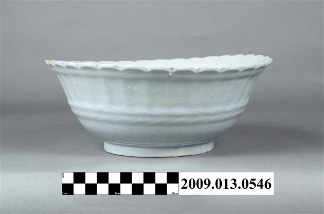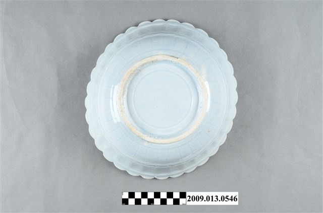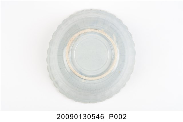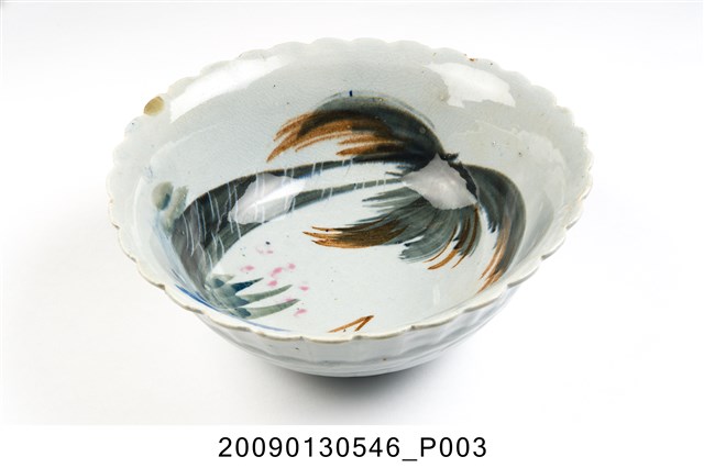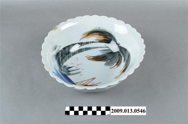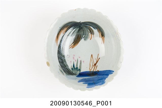 1.彩繪椰樹海景紋菱花口碗,以模製成形,撇口,弧壁下收,圓腹,底有圈足,口沿與碗外壁壓模裝飾菱花瓣造型,碗底心壓模同心圓形造型,增添變化。全器施淡藍釉,釉面細小開片,碗內採手工裝飾技法,左方以綠彩和褐彩描繪高大茂密的椰子樹,草叢間點綴粉色小花,右下方幾筆青色橫線做海景,褐色線條簡筆畫出海面上的小船,成為具南國風情的椰樹海景圖案。2.椰樹海景紋為鶯歌碗盤上常見且有特色的紋飾,海邊高大的椰樹常被畫在碗盤的左方或右方,佔據主要地位。椰子樹多生長在南臺灣地區,日治時期的畫家便注意到臺灣南北景色不同,而將具南國風情的地方特色入畫,並應用至其他器皿上,且一直到二戰後70、80年代。
