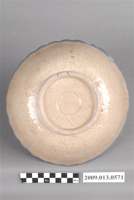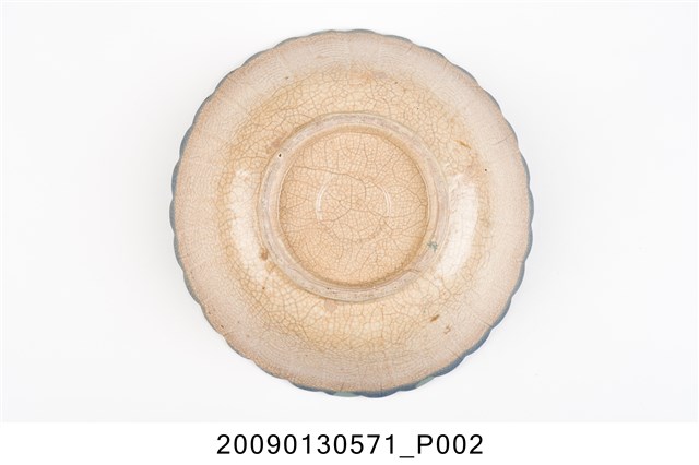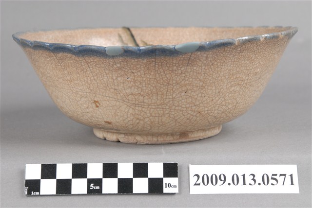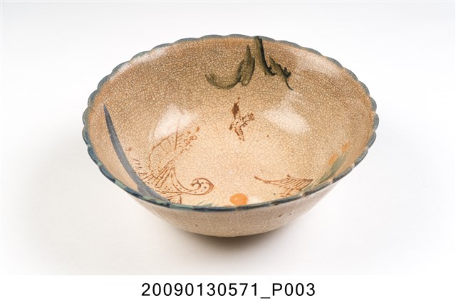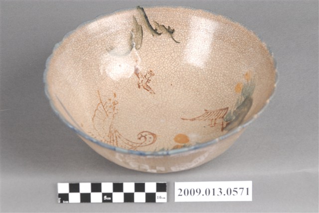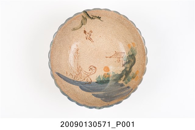 1.彩繪印花山水紋菱花口碗,以模製成形,整體器形略微歪斜,撇口,斜壁下收,圓腹,底有圈足,口沿作菱花造型,碗底心壓模裝飾小同心圓造型,增添變化。全器施白釉,足底露胎,釉面泛黃、佈滿開片紋路,圈足旁微縮釉,口沿和圈足有磕碰缺口和補丁痕跡。口沿施塗一圈青花鈷料裝飾,碗內併用手繪和印花裝飾技法,幾筆淡藍線條描繪海景,右方墨綠、黛綠、橘彩交疊出草叢與花木,呼應上方似富士山形的遠山,空中飛鳥、海面上的帆船和岸上房舍皆以褐彩蓋印,線條工整細膩。2.海景紋是鶯歌碗盤中常見的山水紋飾,常見的構圖為岸上有樹木、岩石、房舍,蔚藍的海面上漂浮著的船隻,上方繪有遠山及飛鳥,其中以富士山形作為背景的海景紋,為模仿日本碗盤上的富士山海景紋而來,此類紋樣至二戰後仍被沿用。加入印花技法裝飾可增加工作效率,方法是將圖案先刻在橡皮圖章上,以圖章沾染釉料印在器皿上,燒製後即得所需圖案。