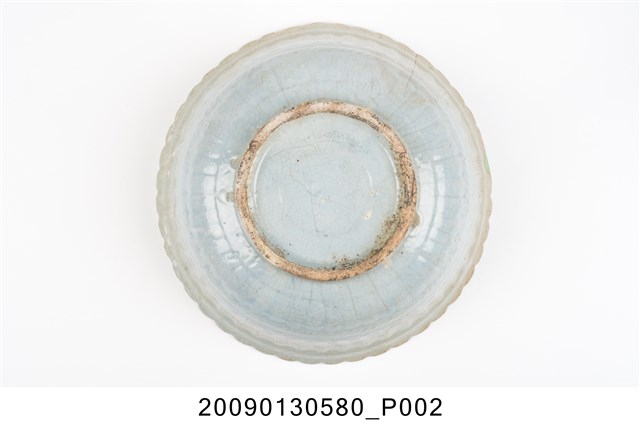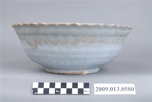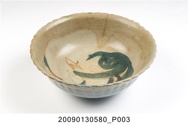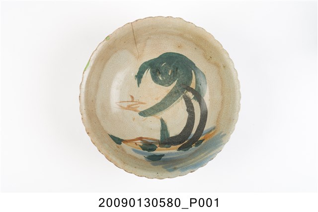 1.彩繪椰樹海景紋菱花口碗,以模製成形,撇口,弧壁下收,圓腹,底有圈足,口沿作菱花造型,碗外壁以壓模裝飾菱花瓣造型,口沿下方和腹部中段壓模裝飾寬橫紋,碗底心亦壓模同心圓形造型,增添變化。全器施淡藍釉,厚重的釉層覆蓋了壓模裝飾的紋路,圈足旁有縮釉痕跡,釉面開片,碗內外壁上半部有黃褐色汙漬痕,使得釉裂紋路更為明顯,碗口沿有一直裂紋。碗內採手工裝飾技法,右方以黑色釉彩大筆畫出高大的椰子樹幹,綠色曲線表現樹葉,下方幾筆褐色和淡青色橫線做沙灘海景與綠色草叢,遠方的褐色線條隨意畫出小船,整體筆觸粗礦隨意。2.椰樹海景紋為鶯歌碗盤上常見且有特色的紋飾,海邊高大的椰樹常被畫在碗盤的左方或右方,佔據主要地位。椰子樹多生長在南臺灣地區,日治時期的畫家便注意到臺灣南北景色不同,而將具南國風情的地方特色入畫,並應用至其他器皿上,且一直到二戰後70、80年代。