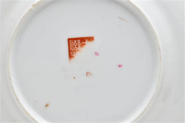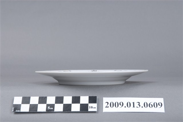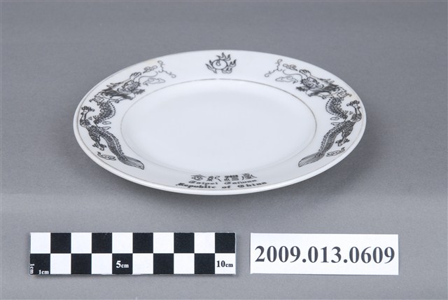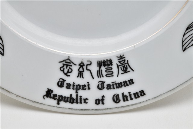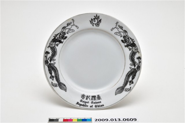 圓唇侈口、寬折沿,淺腹,圈足露胎。口沿與盤面以銀色釉料繪圈紋,折沿處兩端以黑釉印成雙龍搶珠的紋樣,一端印有篆體的「臺灣紀念Taipei Taiwan Republic of China」字樣,是臺灣早期時常將紀念性瓷盤作為送禮收藏之用的例證。黑釉雙龍描繪精細,龍身周圍的雲氣襯托出翻騰雲間之動態。雙龍搶珠是中國常見的傳統紋樣,代表祥瑞吉祥珍貴之意。盤底有紅色方印「大□磁器」款識。