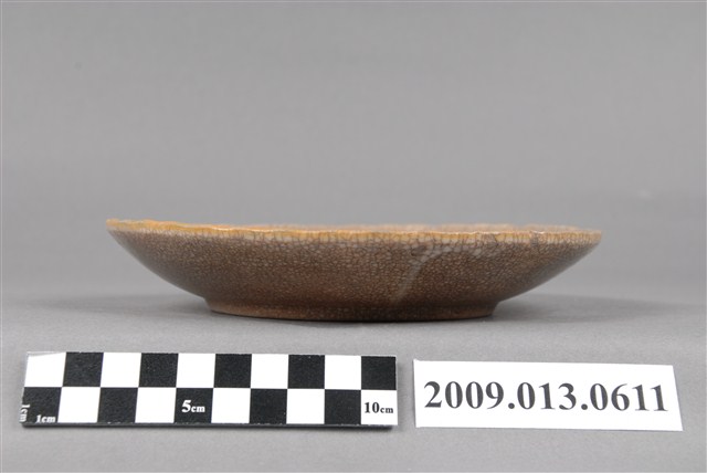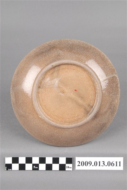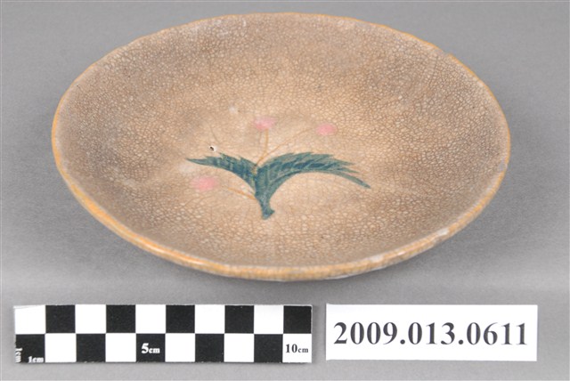 圓盤。紅陶胎,覆鏇壓法製作,無底款。此圓盤用以裝盛菜肴。平底,弧腹,圓唇,以覆式鏇壓法製作,器面以淺浮雕裝飾,器心為折枝花卉,周圍環繞樹葉紋。低圈足,無款識,應是臺灣北部地區的產品,但窯場不詳。紅陶胎質,但質地堅硬,為石陶器質(stoneware)。全器以釉下彩繪裝飾,但只在器心的花卉上塗上綠色的葉子,褐色的枝條與粉紅色的珠狀花蕾。全器施以透明釉,釉面有細密的開片,因為胎質的關係,整件作品顯得十分灰暗,色料呈色不鮮明。畫面主要以淺浮雕表現,配合人工簡單上彩,成為淺浮雕與彩繪綜合表現的例子,很適於量產。所畫的紋飾看不出是何種花卉,成為一種時代風格。