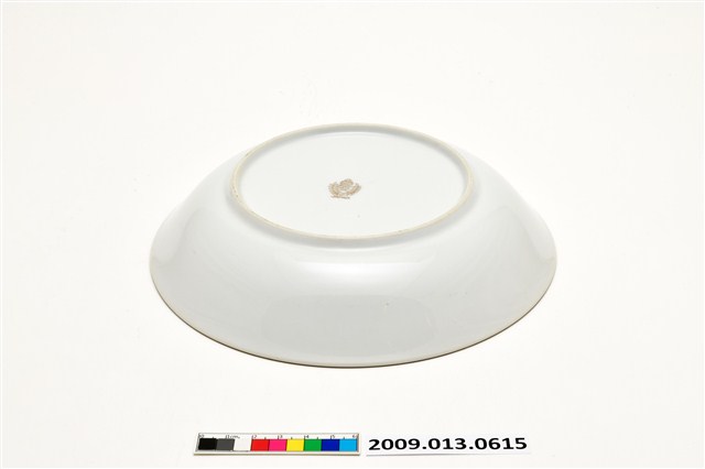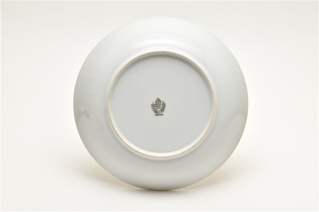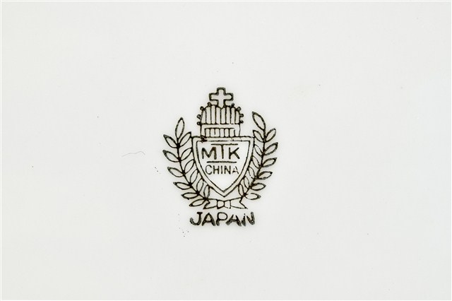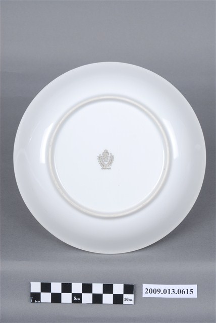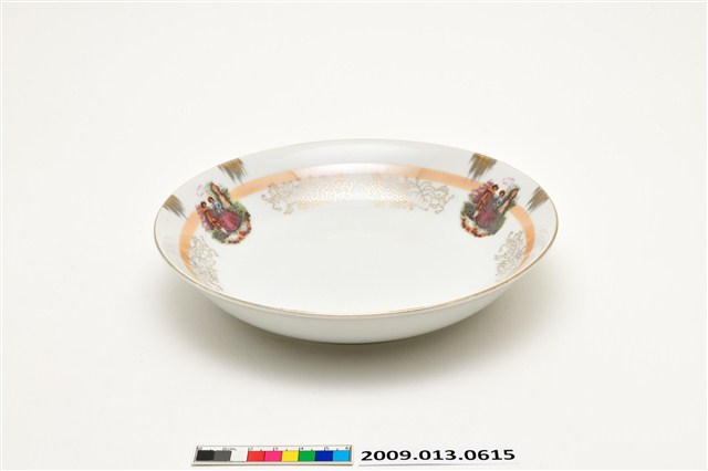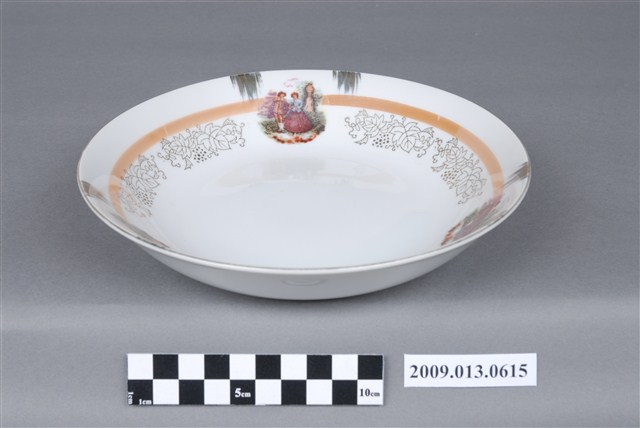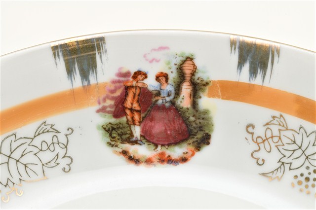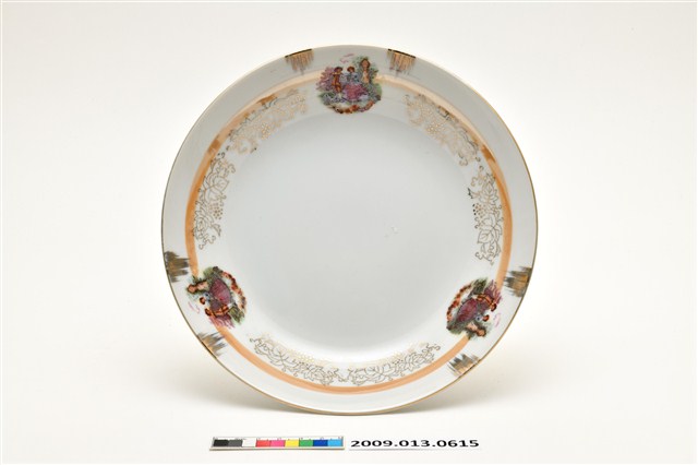 本件圓盤圓唇侈口、圓腹下斂至圈足,圈足露胎。口沿以筆刷施塗金屬釉,透過筆觸營造出立體感。內側以金彩繪圈紋,圈紋內側印有葡萄紋,金邊鏤空,造型簡約,線條流暢,象征著多子多福。圈紋間以彩釉轉印三處相同的人物紋,可見為一對歐洲貴族夫婦,他們舉止親暱、衣著華麗。神情動作無不纖毫畢現,惟妙惟肖。整件盤巧妙地將寫意畫法與工筆畫法雜糅在一起,技藝十分高超。盤底印有「MIK CHINA」的標誌,應為日本所生產。
